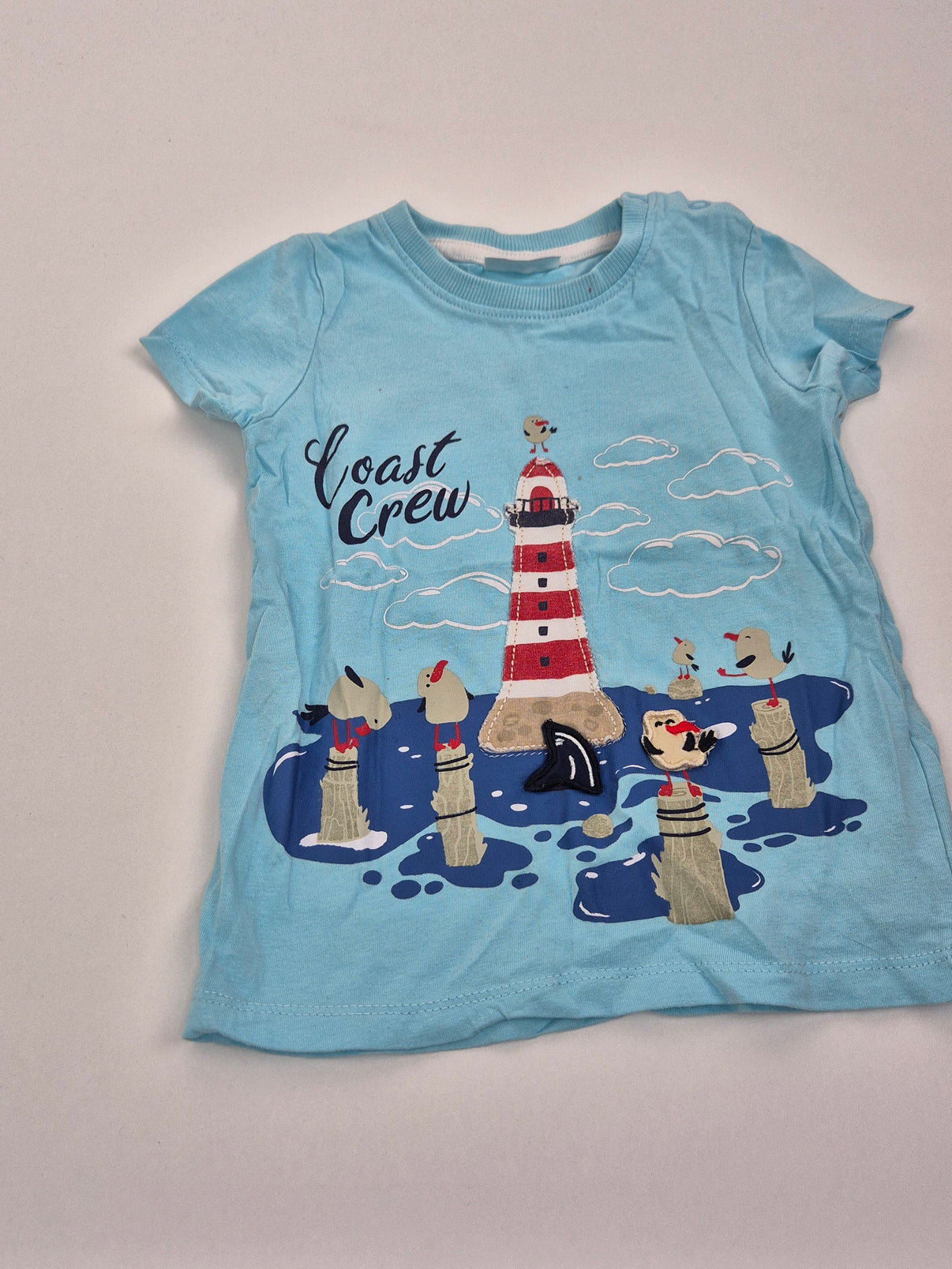 Svěží světle modré tričko Pepco s krátkým rukávem a veselým námořnickým motivem „Coast Crew“. Přední stranu zdobí maják, racci a mořské detaily, které dodávají tričku letní a hravý styl. Příjemný bavlněný materiál je ideální na každodenní nošení – do školky, na výlety i na hřiště.