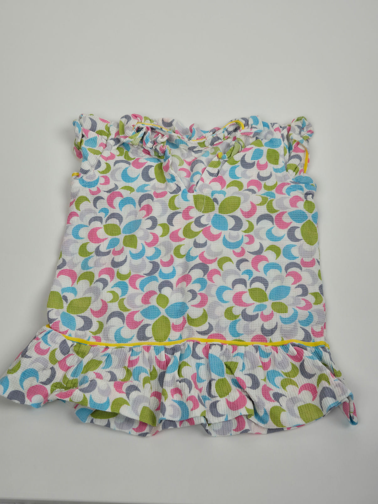 Lehká letní tunika ve velikosti 86/92, ideální pro holčičky. Bílý základ oživuje výrazný barevný květinový vzor v odstínech růžové, zelené, modré a šedé. Volánkové zakončení a jemné řasení kolem výstřihu...