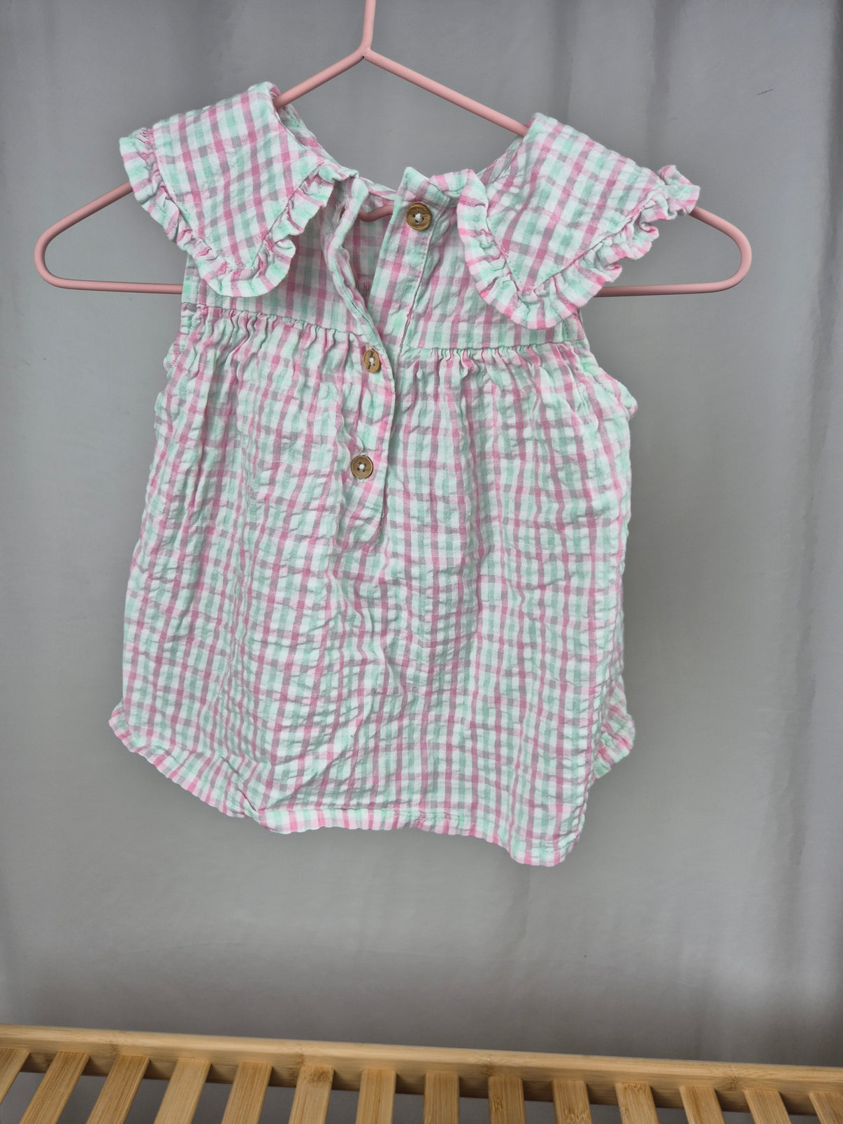 Roztomilá dívčí tunika značky Tu, velikost 68/74. Jemný kostkovaný vzor v růžové, bílé a světle zelené barvě působí svěže a letně. Zdobená volánkovým límečkem a zapínáním na dřevěné knoflíčky na hrudi. Lehký a prodyšný materiál dělá z tuniky ideální kousek na teplé dny, snadno se kombinuje s legínkami nebo kraťásky.