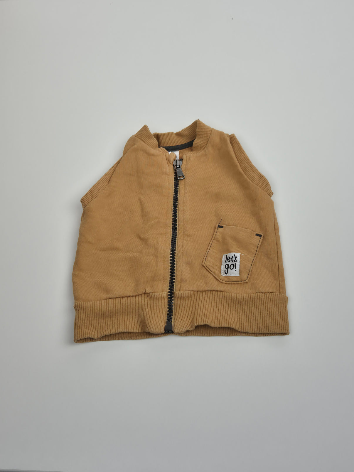 Stylová vesta v teplém hnědo-karamelovém odstínu je skvělým doplňkem do chladnějších dnů. Příjemný, měkký materiál zahřeje bez zbytečného omezení pohybu a pohodlně se vrství přes body nebo mikinu. Zapínání na zip usnadní oblékání a malé nášité kapsičce s nápisem let’s go! dodává vesta hravý detail. Díky neutrální barvě se hodí jak pro kluka, tak i pro holčičku – ideální do kočárku, na procházky i na cestu do školky.