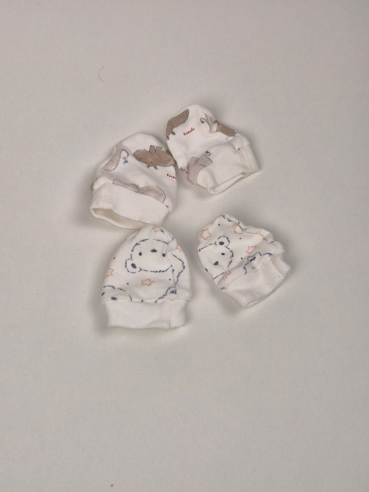 Oba páry jsou v jemných neutrálních barvách – bílé s motivem zvířátek a hvězdiček, vhodné pro holčičku i chlapečka.