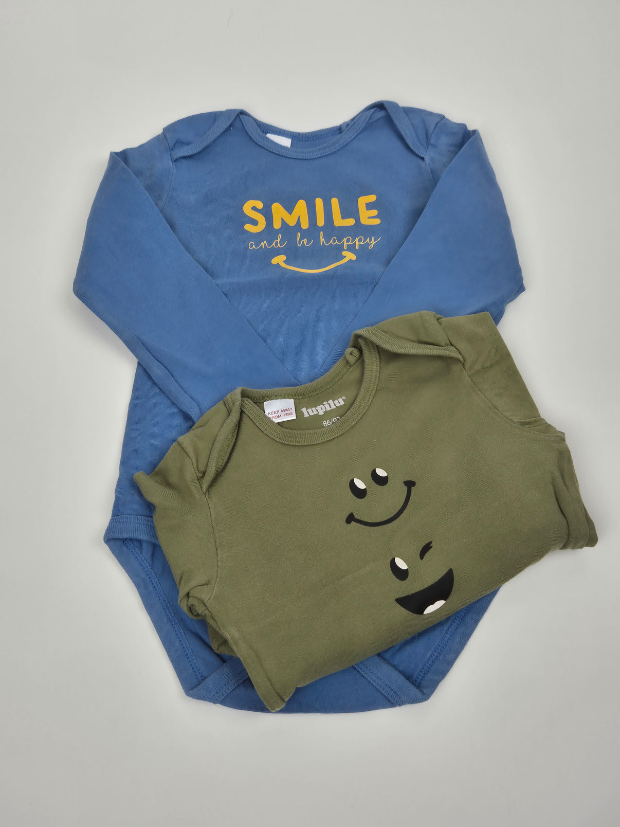 Veselá sada dvou body s dlouhým rukávem od značky Lupilu je ideální volbou pro pohodlné každodenní nošení malých kluků. První body v modré barvě zdobí pozitivní nápis „SMILE and be happy“ s úsměvem ve žlutém provedení, který okamžitě zlepší náladu. Druhé body v khaki odstínu zaujme výrazným potiskem dvou roztomilých usměvavých obličejíků, které dodávají outfitu šmrnc a hravost.