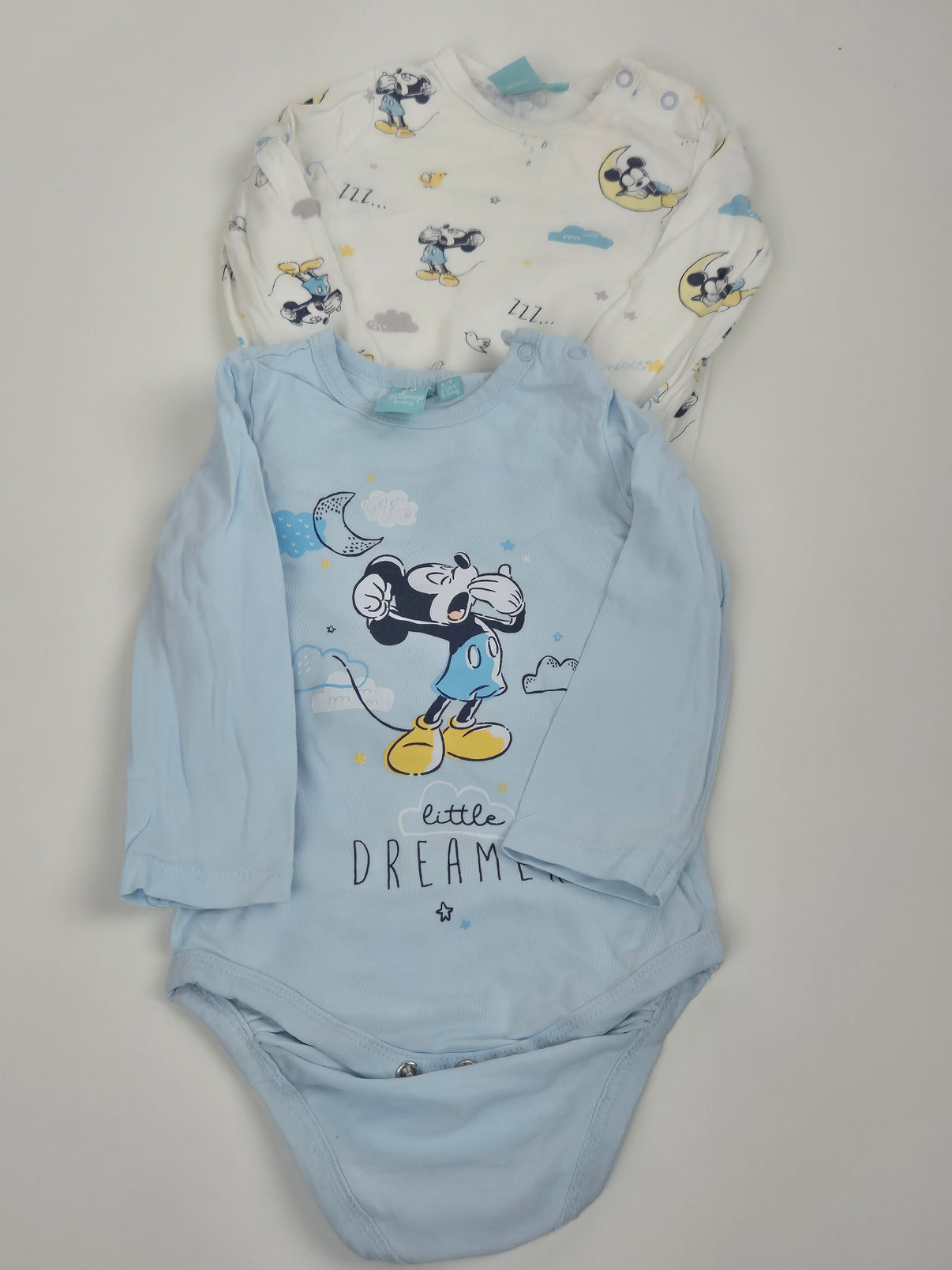 Pohodlná sada 2 body s motivem Mickey Mouse ve velikosti 74 je jako stvořená pro malé snílky. Světle modré body s nápisem little dreamer zdobí roztomilý Mickey mezi hvězdičkami a měsíčky. Druhý kousek má bílý základ a celoplošný potisk spícího Mickeyho, mráčků a nápisů ZZZ…. Oboje body mají dlouhý rukáv, měkký bavlněný materiál a praktické zapínání na rameni i mezi nožičkami. Ideální volba na spaní i denní nošení. Vhodné pro chlapečky.