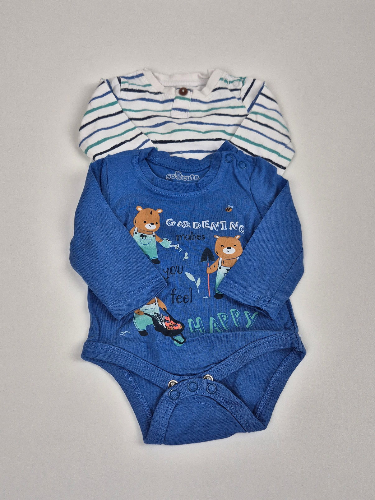 Sada dvou chlapeckých body značky Pepco ve velikosti 62. První kousek je v hravém modrém provedení s potiskem medvídků a veselým nápisem, druhý v univerzálním proužkovaném designu v bílé s modrými a zelenými pruhy. Body mají dlouhý rukáv a praktické zapínání mezi nožičkami i na ramínku, což usnadňuje převlékání i přebalování. Skvělé na každodenní nošení.