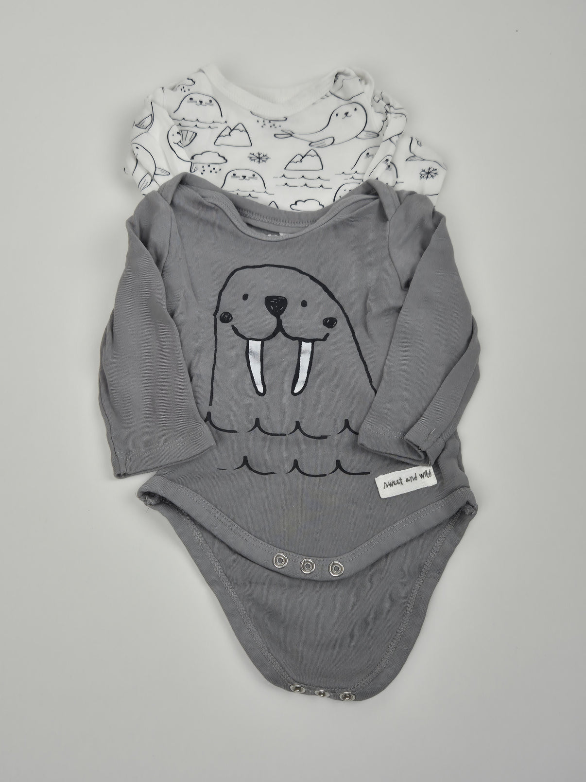 Stylová sada 2 body z Pepca ve velikosti 68 potěší milovníky severské přírody. První kousek v tmavě šedé barvě zdobí roztomilý mrož s výraznými kly, druhé body má bílý základ a celoplošný potisk tuleňů, ledových ker a sněhových vloček v jemné černé lince. Obě body mají dlouhý rukáv, příjemný bavlněný materiál a praktické zapínání mezi nožičkami i na rameni. Ideální pro chladnější dny, na doma i na ven. Vhodné pro chlapečky.