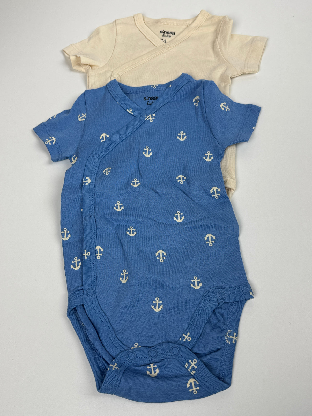 Krátký rukáv, zapínání na cvočky po celé délce – pohodlné oblékání. Jedno body v jednoduchém krémovém provedení, druhé modré s potiskem bílých kotev.