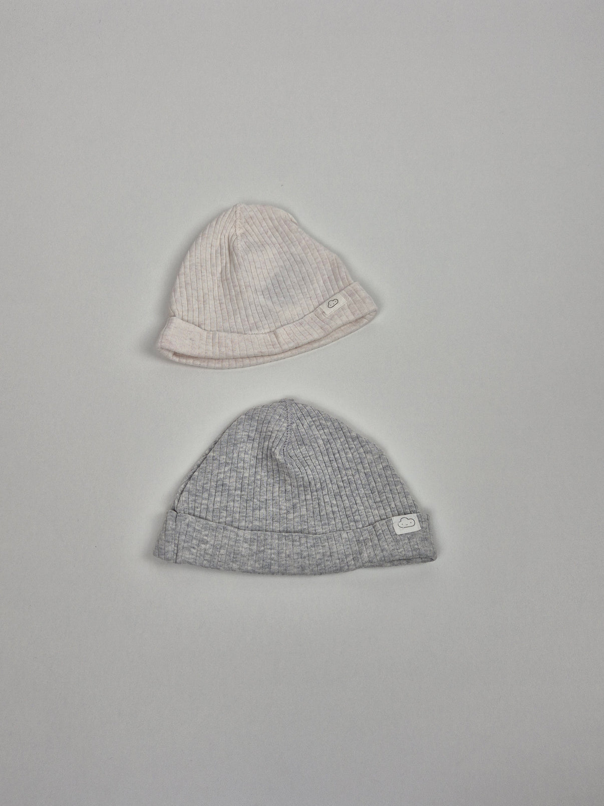 Měkoučká sada dvou kojeneckých čepiček z žebrovaného úpletu v jemně růžové a světle šedé barvě. Díky pružnému materiálu se dobře přizpůsobí hlavičce miminka a drží na místě bez nepříjemného tlačení. Stylový minimalistický detail s mrakem dodává čepičkám hravý nádech. Ideální pro holčičky i chlapečky. Značka H&M.