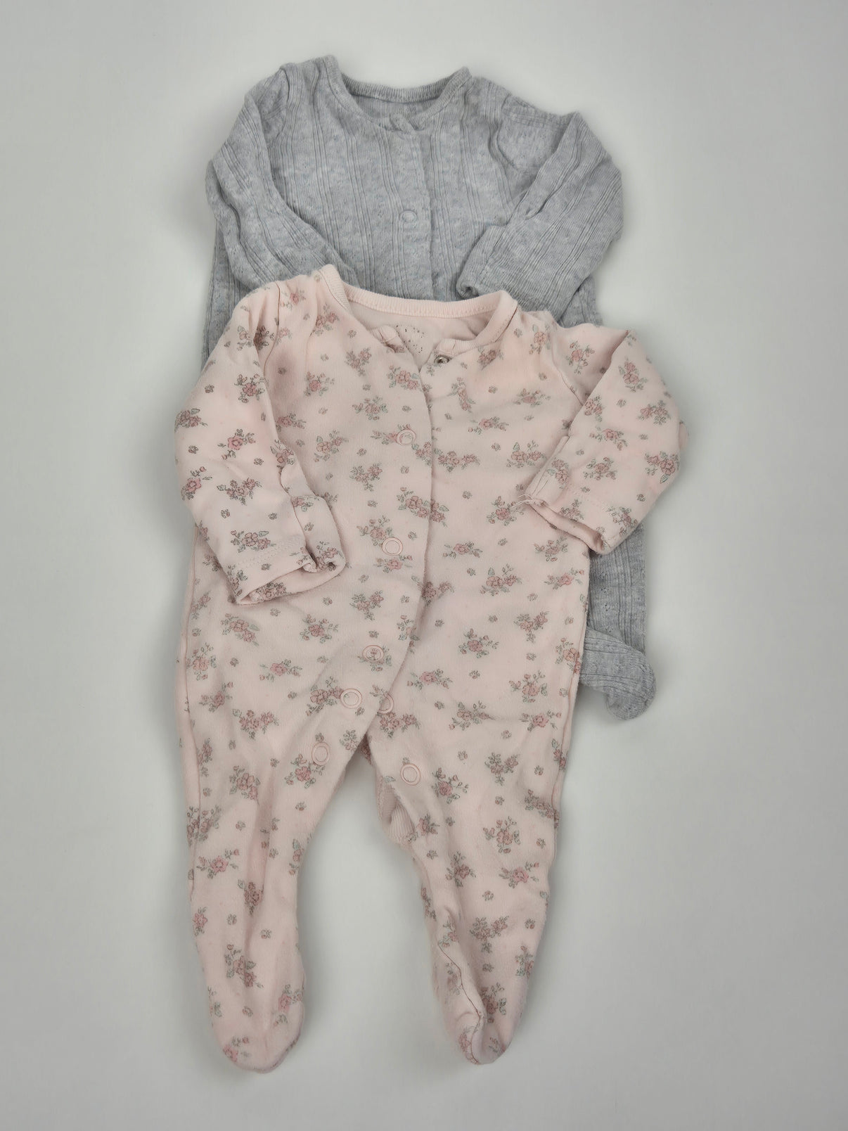 Roztomilá sada 2 kojeneckých dupaček značky F&F, ideální pro první týdny miminka. Jedny dupačky jsou v jemné pastelově růžové barvě s něžným květinovým potiskem – krásná volba pro holčičku. Druhé jsou v univerzální světle šedé barvě s žebrovanou strukturou, hodí se pro holčičku i chlapečka. Oba kousky mají zapínání na cvočky pro snadné přebalování a příjemný materiál, který je hebký na dotek a šetrný k citlivé pokožce miminka. Skvělé na doma, na spaní i do kočárku.