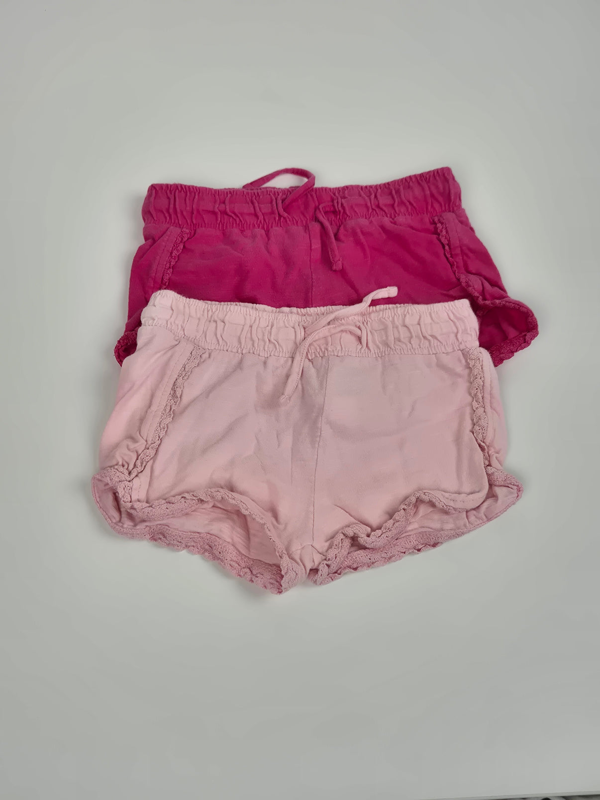 Sada dvou kraťásků F&F ve velikosti 86 potěší na teplé dny. Jeden kousek je světle růžový s jemnou krajkou na okrajích, druhý malinově růžový s jednoduchým lemem. Oba mají pohodlný pas na gumu se šňůrkou. Skvěle se hodí na hřiště, dovolenou i běžné nošení. Určeno pro holčičky.