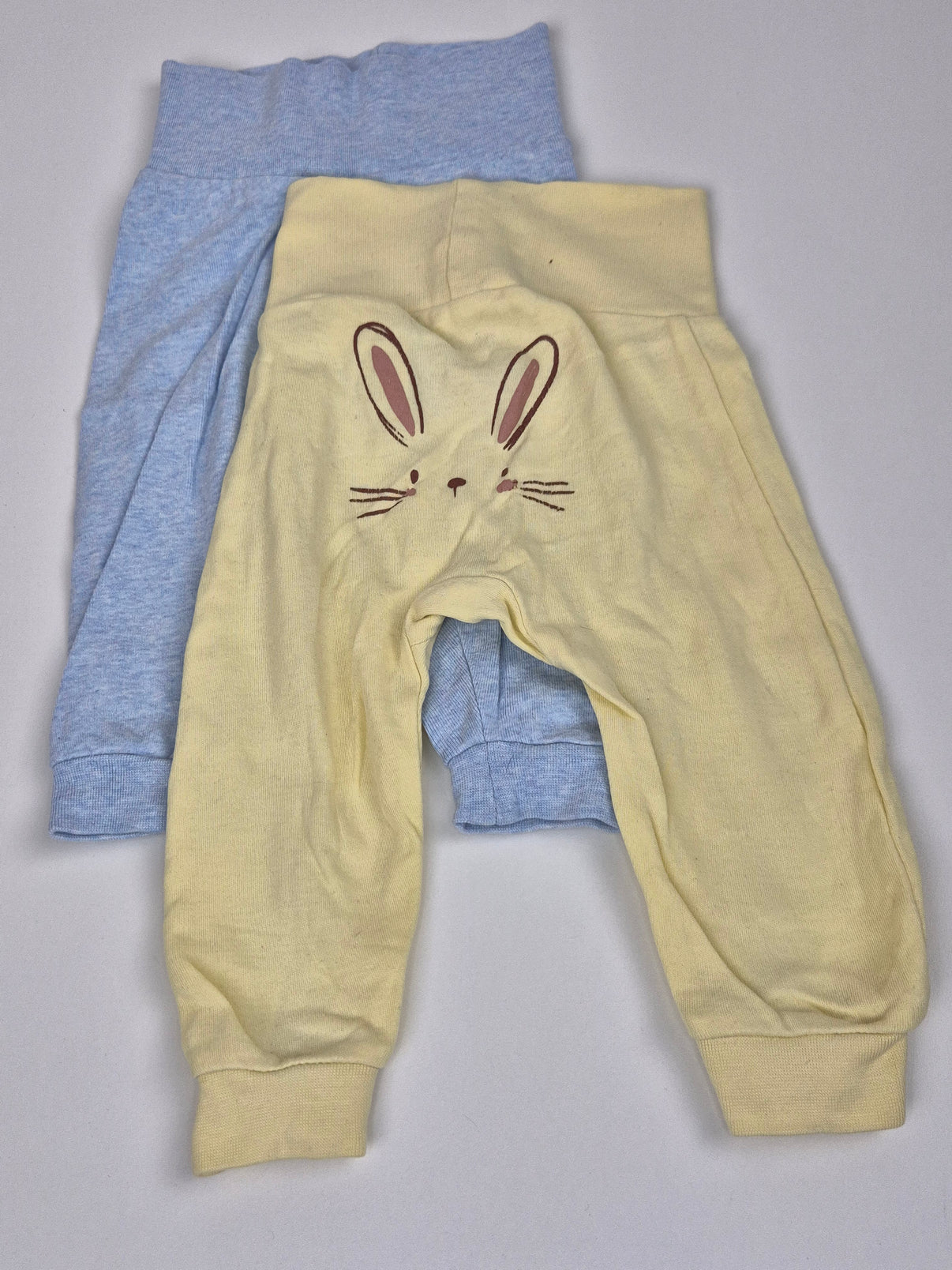 Sada dvou dětských legín značky Lupilu ve velikosti 62/68. První kousek je světle modrý, druhý světle žlutý s roztomilým potiskem zajíčka na zadečku. Příjemný bavlněný materiál a pružný pas zajišťují maximální pohodlí. Ideální na doma i na procházky.