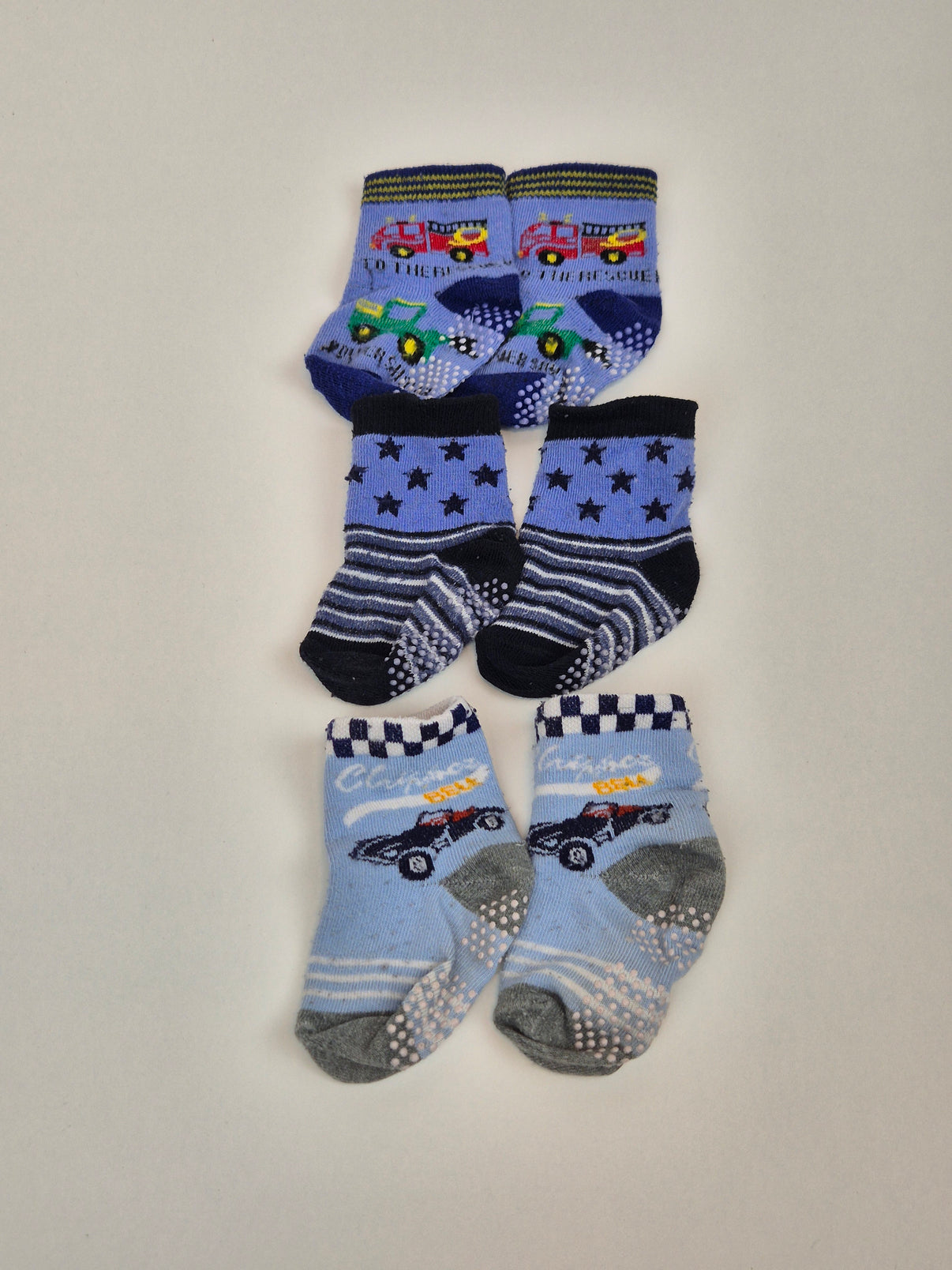 Sada tří párů roztomilých dětských ponožek ve velikosti 11/14, ideální pro chlapečky kolem velikosti 68/74. Každý pár má jiný motiv – od autíček, traktorů až po hvězdičky – takže se skvěle hodí na doma i do kočárku. Protiskluzová úprava na chodidle zajišťuje bezpečnější první krůčky i hraní na hladké podlaze.