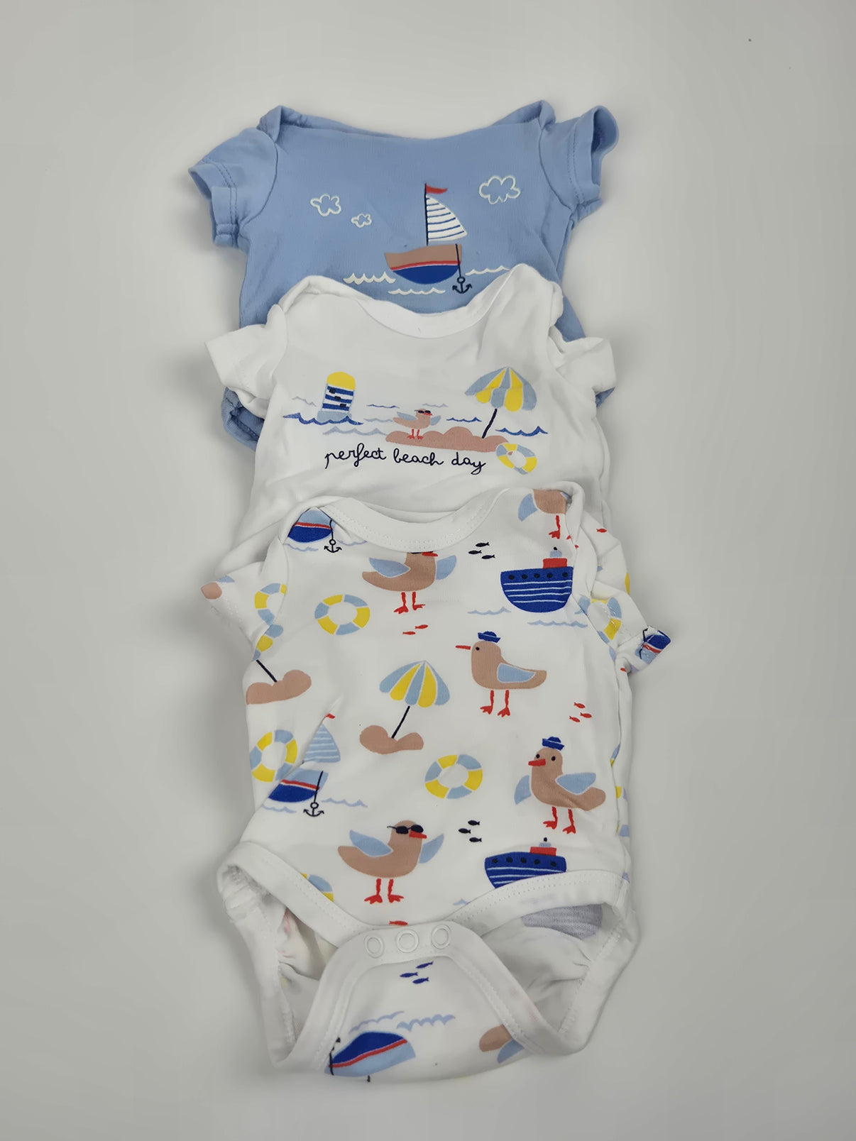 Letní sada 3 bavlněných body z Pepca ve velikosti 56 vnáší do dětského šatníku pořádnou dávku mořské pohody. Světle modré body s plachetnicí, bílé s nápisem perfect beach day a třetí kousek s celoplošným potiskem racků, lodí, slunečníků a plážových motivů – to vše laděné v příjemných tónech modré, žluté a červené. Praktické zapínání mezi nožičkami zajišťuje pohodlné přebalování. Ideální volba na teplé dny, na doma i na dovolenou. Vhodné pro chlapečky.