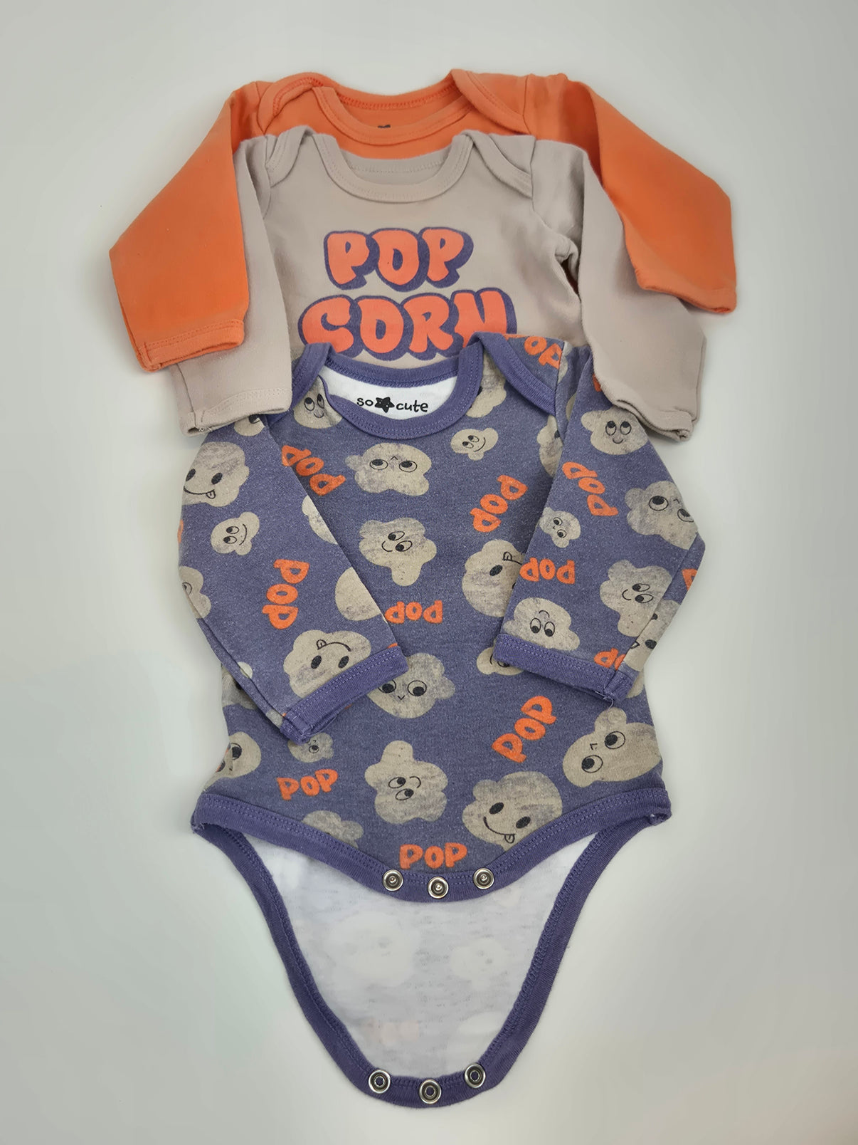 Sada 3 kusů kojeneckých body značky Pepco ve velikosti 68. Všechny body mají dlouhý rukáv a veselý motiv popcornu – jedno s nápisem "POP CORN" v oranžovo-béžové kombinaci a další s potiskem roztomilých kukuřičných zrníček a nápisem "POP". Praktické zapínání mezi nožičkami usnadňuje přebalování. Perfektní volba pro každodenní nošení s hravým a originálním designem.