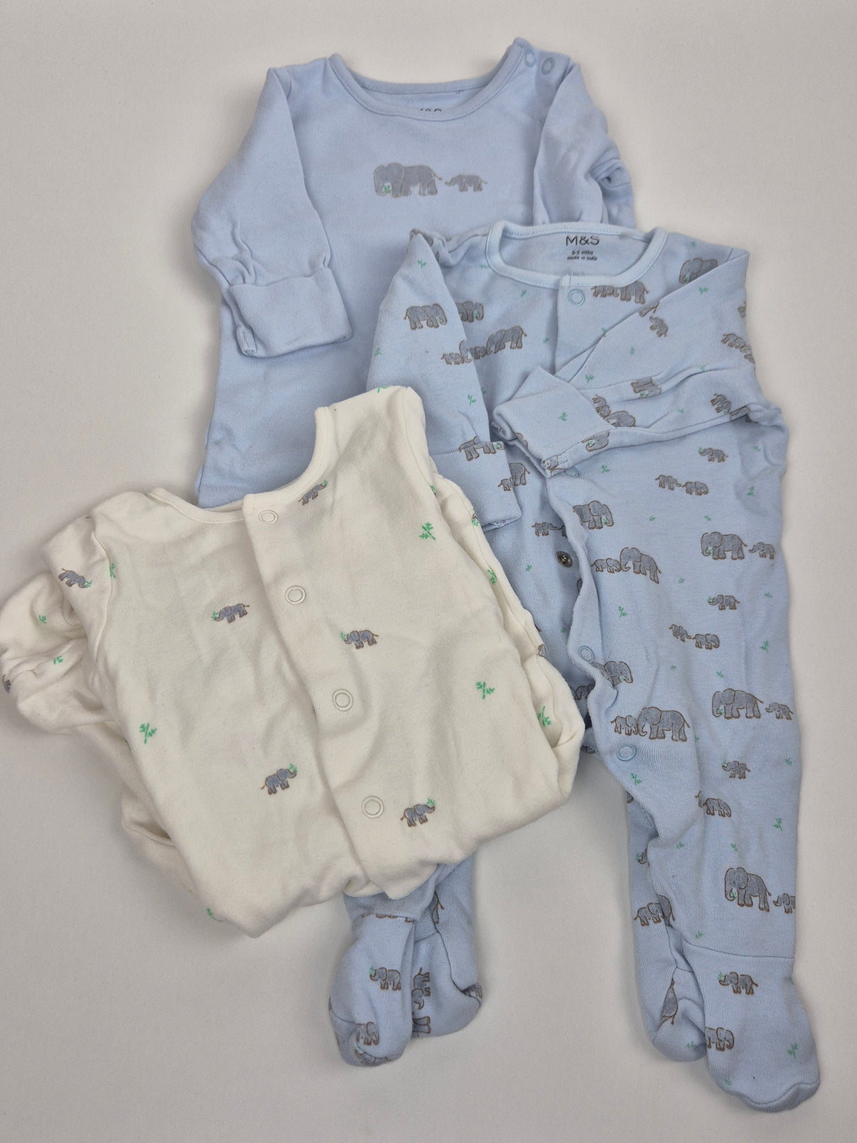 Roztomilá sada 3 kojeneckých dupaček v jemných odstínech modré a smetanové, ideální pro pohodlné nošení přes den i na spaní. Všechny dupačky jsou zdobené motivem slonů a drobných rostlinek, s praktickým zapínáním na patentky po celé délce. Měkký materiál je šetrný k dětské pokožce a zajišťuje maximální komfort. Skvělá volba pro chlapečky. Značka Marks & Spencer.