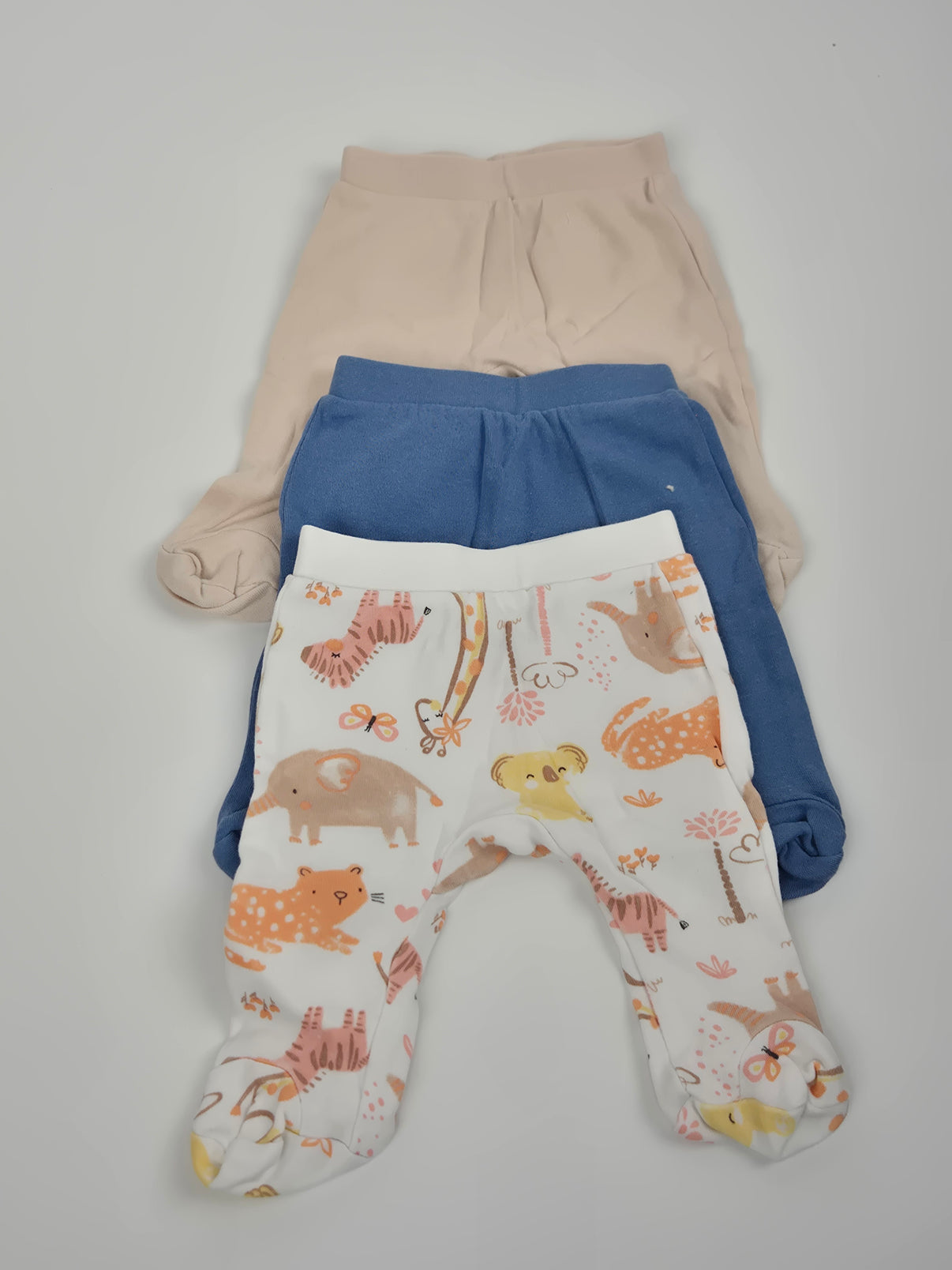Pestrobarevná sada 3ks polodupaček z Pepca ve velikosti 56 je ideální pro pohodlí nejmenších miminek. První kousek zaujme veselým potiskem safari zvířátek na bílém podkladu – najdeš tu slony, žirafy, koaly i lvíčata. Druhé polodupačky jsou v jednolité modré barvě, třetí v jemném béžovo-růžovém odstínu. Všechny mají širší pružný pas a zakryté nožičky, což zajišťuje teplo a pohodlí během celého dne.