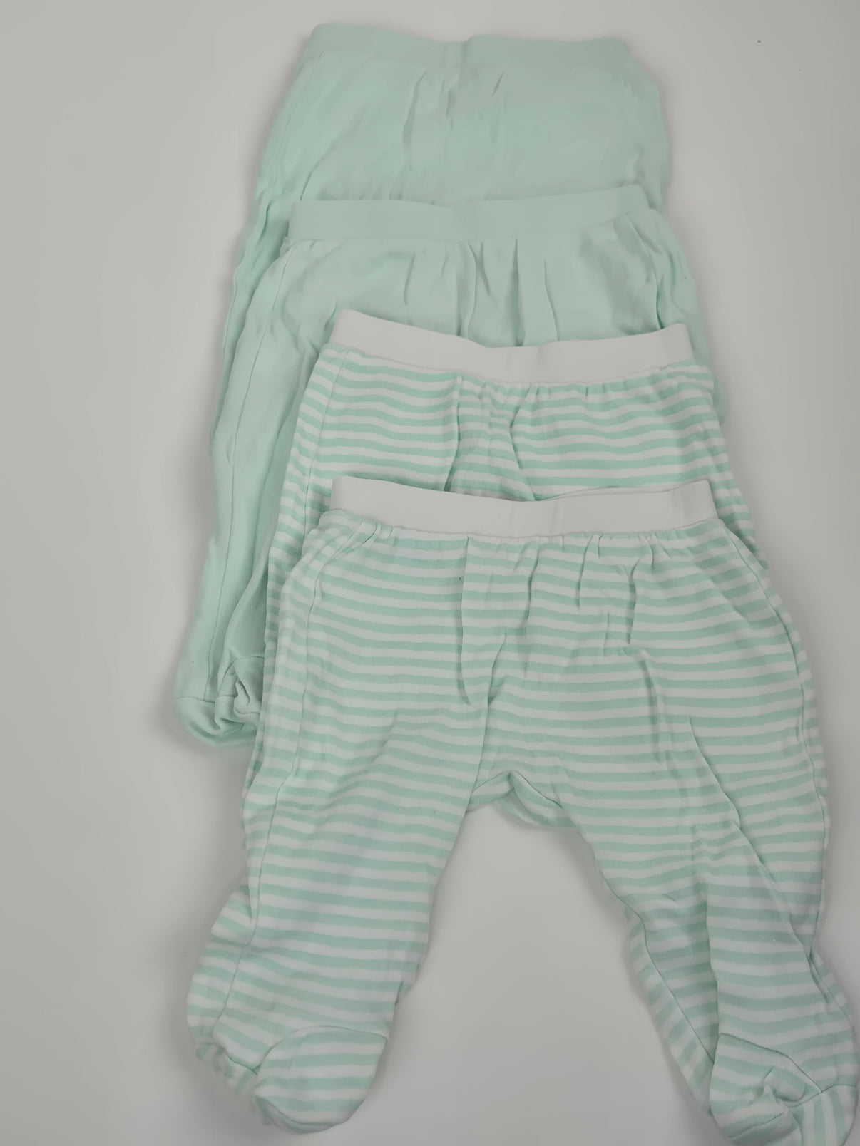 Sada 4 ks měkoučkých polodupaček značky Pepco ve velikosti 62 je ideální výbavou pro každé miminko. V balení najdeš dva jednobarevné kousky v jemném mátovém odstínu a dva proužkované s bílým pasem. Díky pohodlnému střihu s krytými chodidly a pružným pasem jsou ideální na spaní, odpočinek i běžné nošení doma.