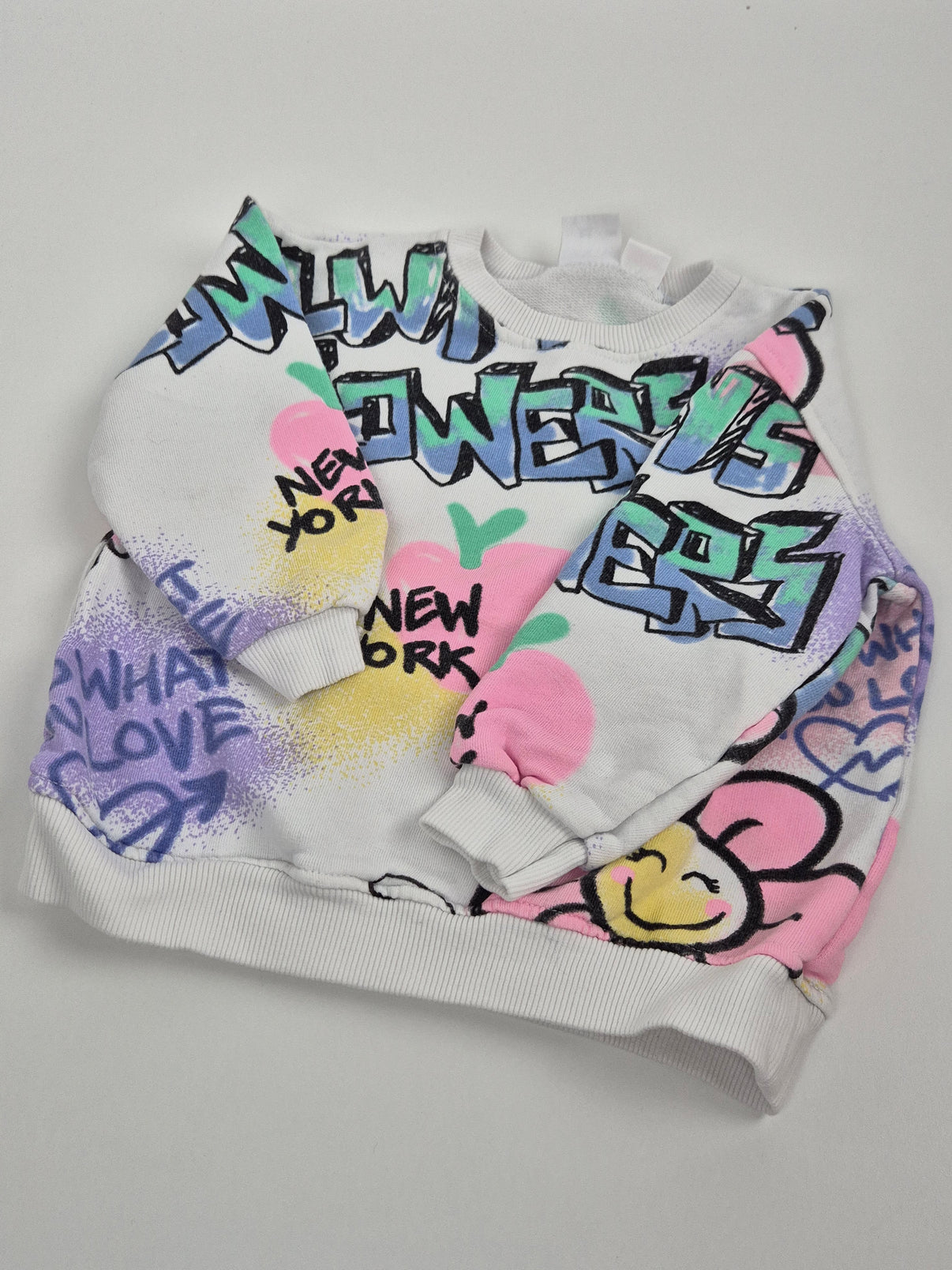 Originální dívčí mikina Zara ve velikosti 104 přináší veselý street-art styl plný barev a hravých motivů. Bílý základ zdobí výrazné nápisy, graffiti prvky, srdíčka, květiny a smajlíky v pastelových i sytých tónech – nechybí ani nápisy jako New York, Power nebo Love. Mikina má klasický střih s pružnými lemy a měkký vnitřek pro maximální pohodlí. Ideální na běžné nošení pro malé slečny, které se nebojí vyčnívat – stylová, zábavná a pohodlná.