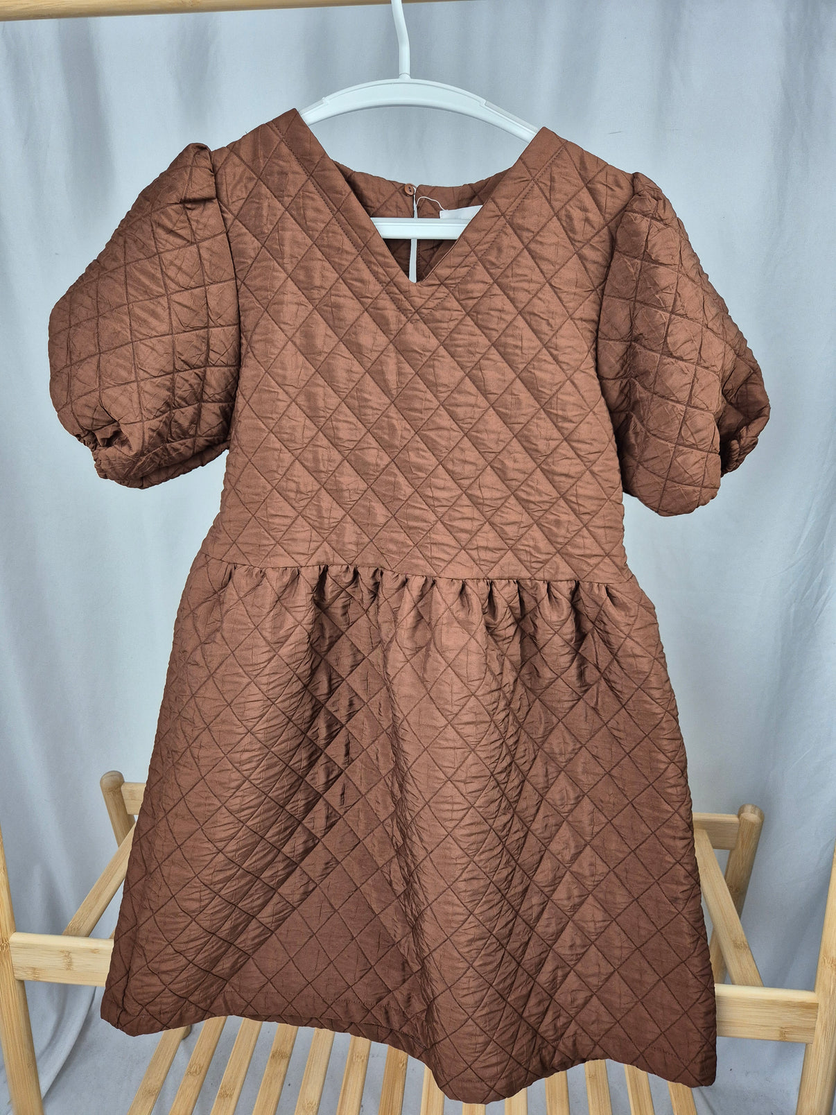 Pohodlné a stylové prošívané šaty v teplé kaštanově hnědé barvě potěší každou slečnu, která má ráda originální a přitom praktické kousky. Díky jemnému lesku a nadýchaným rukávům působí slavnostně, zároveň ale zůstávají pohodlné na běžné nošení – třeba do školy nebo na návštěvu. Prošívání po celé ploše dodává šatům strukturu i zajímavý vzhled. Kousek pochází ze značky Zara a skvěle se hodí na podzim i zimu – můžeš ho snadno doplnit legínami nebo punčochami. Ideální pro holky, které chtějí vypadat elegantně a cítit se příjemně.