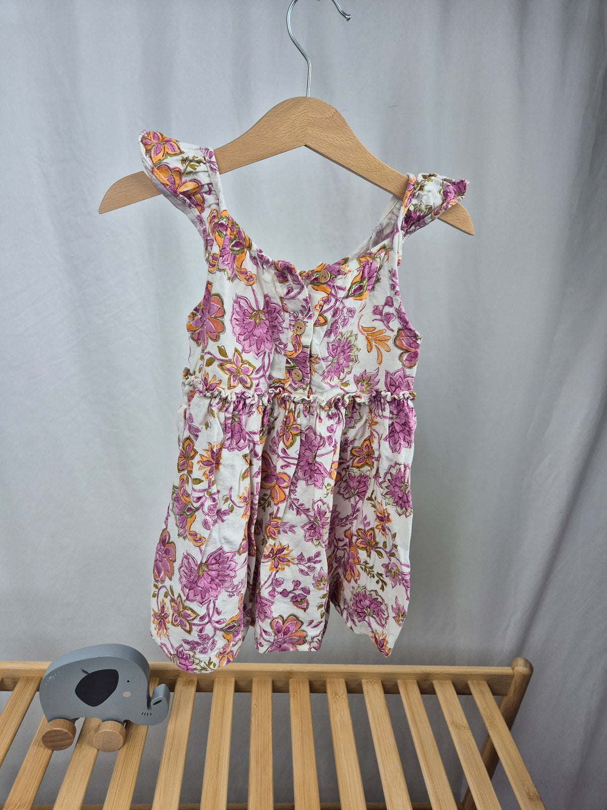 Letní dívčí šaty s romantickým květinovým vzorem v odstínech růžové, oranžové a zelené jsou ušité z lehkého materiálu s příměsí lnu – ideální pro horké dny. Volnější střih s nabíraným pasem a jemně řasenými ramínky zajišťuje pohodlí i styl. Skvělá volba na dovolenou, slavnostní příležitosti i běžné nošení. Pro holčičky. Značka Zara.