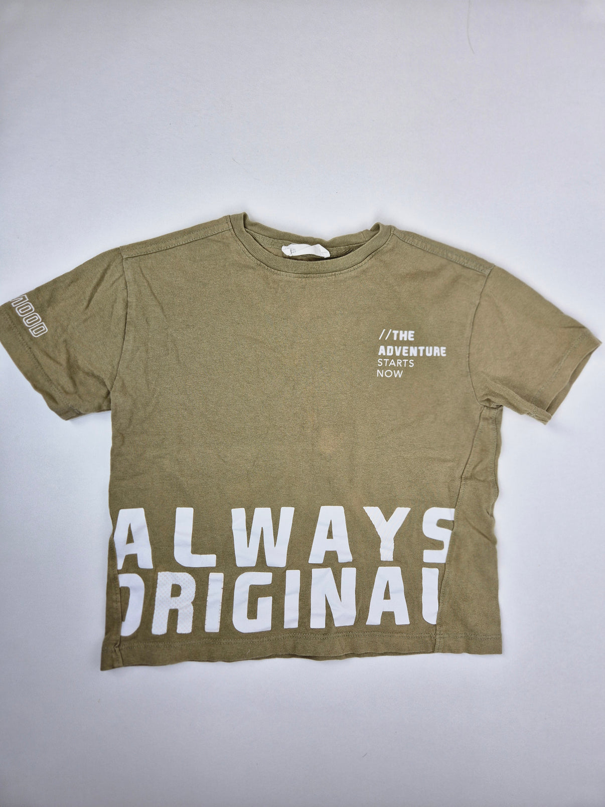 Je v trendy khaki barvě s výraznými bílými nápisy — na hrudi „THE ADVENTURE STARTS NOW“ a dole po celé šířce „ALWAYS ORIGINAL“.