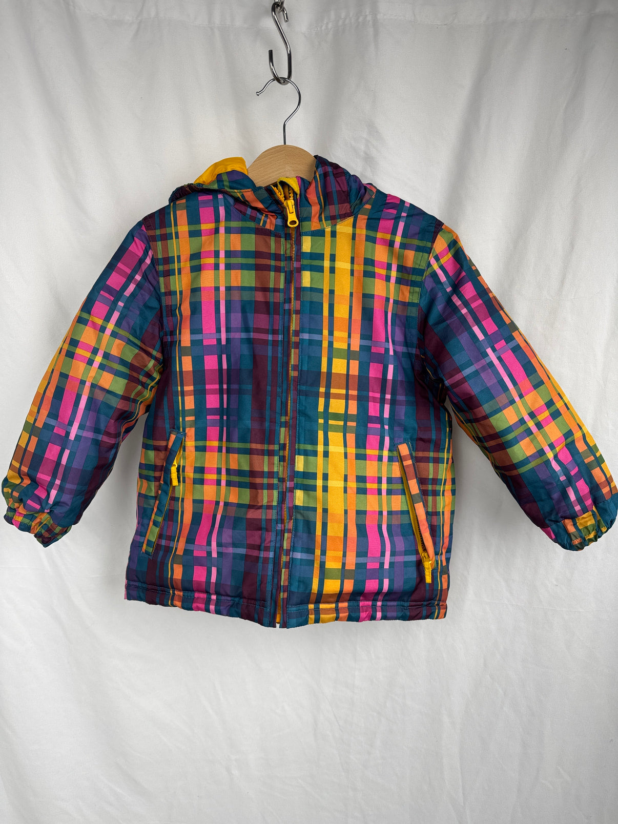 Barevná zimní bunda C&A ve velikosti 110, která vynikne na první pohled svým veselým kostkovaným vzorem v tónech žluté, růžové, tyrkysové a modré. Uvnitř má hřejivou žlutou podšívku a praktickou odepínací kapuci. Bunda je lehká, ale krásně teplá, takže ideální na zimu do školky, na hřiště i na výlety. Nechybí ani kapsy na zip a pružné lemy, které brání pronikání chladu.