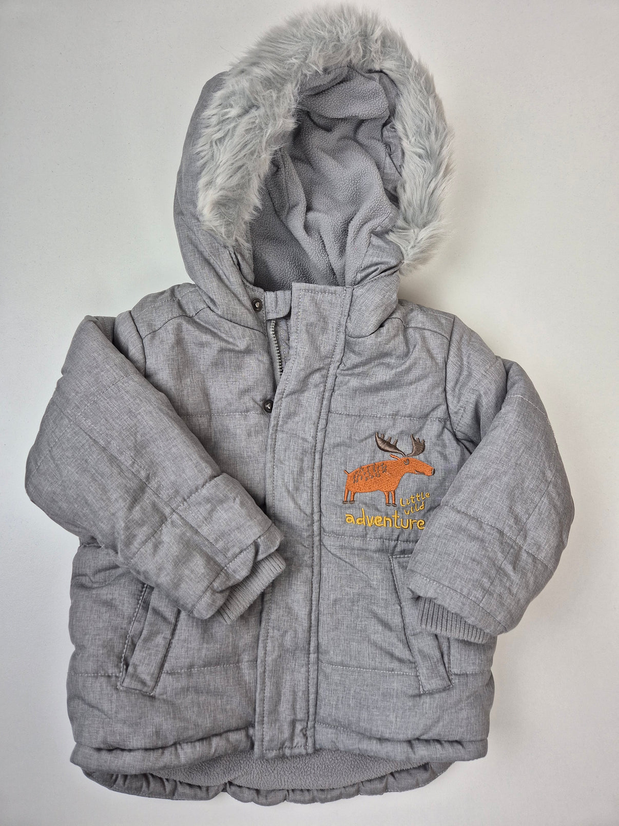 Hřejivá zimní bunda Cool Club v univerzální světle šedé barvě je perfektní kousek pro malé dobrodruhy. Má měkoučkou fleecovou podšívku, která krásně zahřeje, a kapuci lemovanou hebkým kožíškem pro extra komfort v chladném počasí. Praktické zapínání na zip i druky, žebrované vnitřní náplety v rukávech a roztomilá výšivka losa Little Wild Adventure dodávají bundě styl i funkčnost.