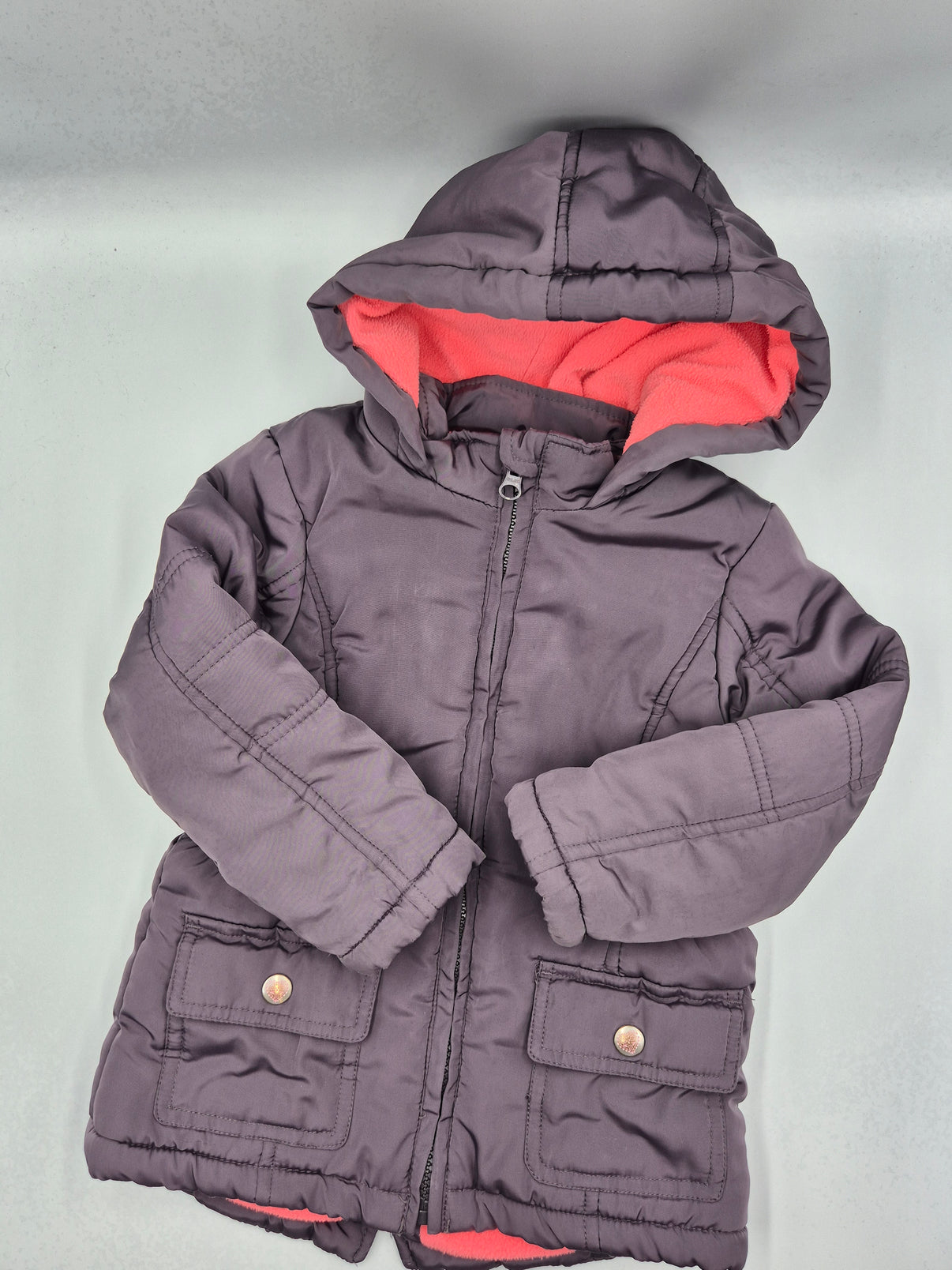 Praktická dětská zimní bunda F&F s kapucí ve velikosti 98, která spolehlivě zahřeje v chladnějších dnech. Bunda má jemný šedofialový (taupe) odstín, který působí elegantně a snadno se kombinuje s dalšími kousky v dětském šatníku.