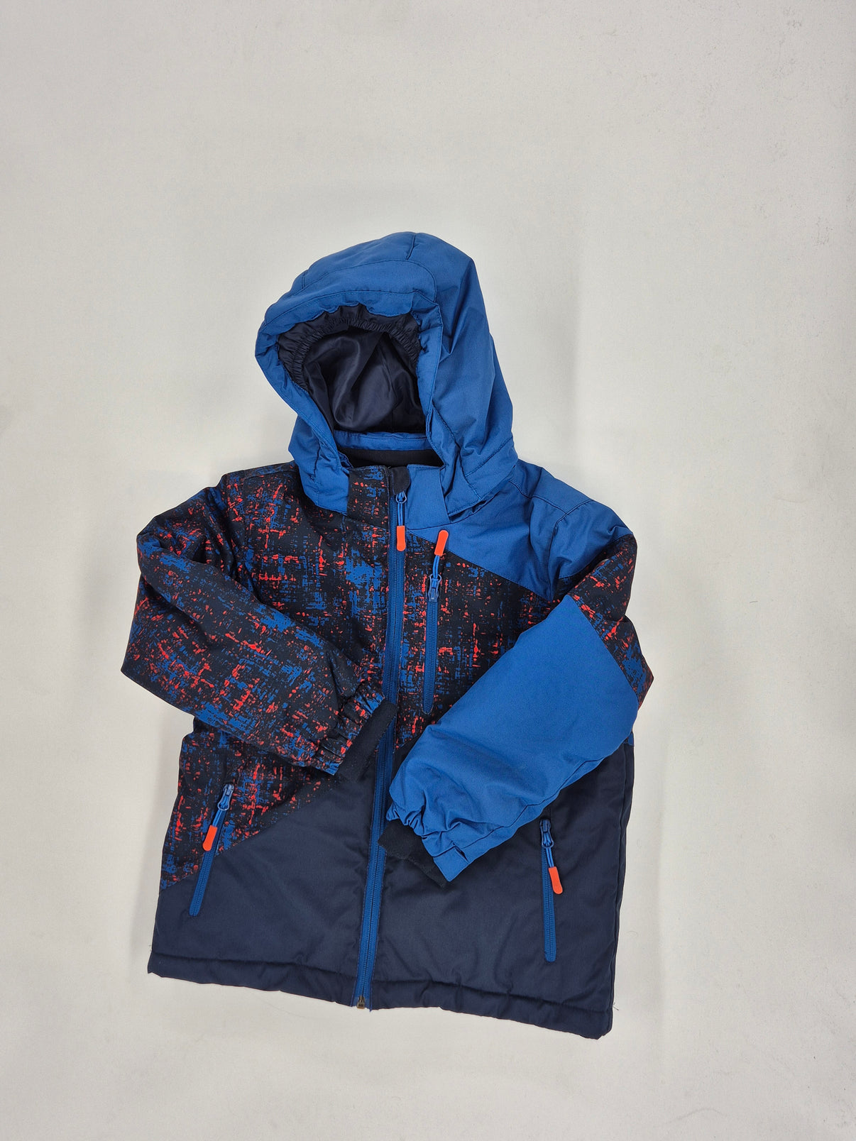 Dětská zimní bunda Lewro ve sportovním designu v kombinaci tmavě modré a sytě modré barvy s moderním abstraktním vzorem doplněným o červené detaily. Bunda působí velmi dynamicky a je ideální pro aktivní děti.