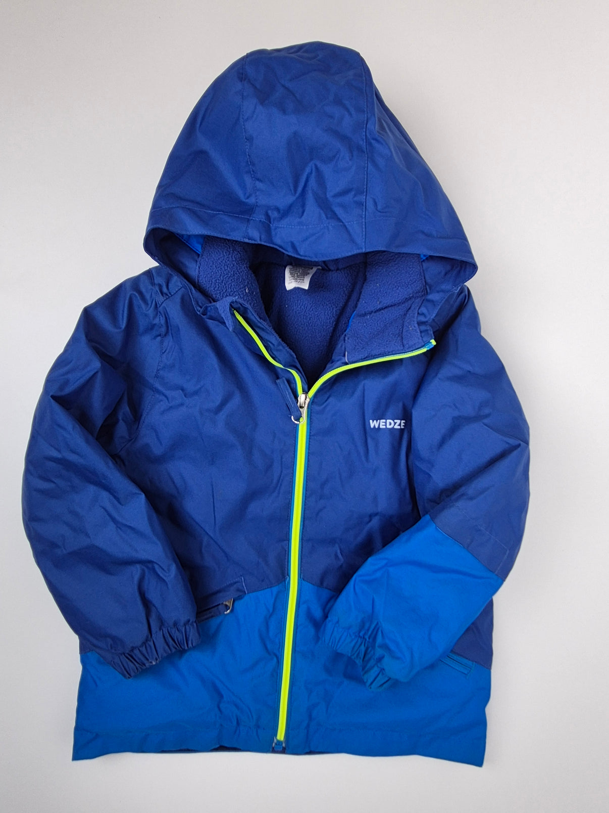 Sportovní zimní bunda Wedze ve velikosti 98/104 je skvělý kousek pro aktivního kluka na hory, do školky i na každodenní zimní pobíhání venku. Kombinace tmavě modré a jasně modré barvy působí moderně a díky neonově žlutému zipu se bunda hezky zvýrazní. Má hřejivou fleecovou podšívku, praktickou kapuci, elastické manžety a odolný svrchní materiál, který ochrání před větrem a sněhem. Ideální parťačka na celou zimu.