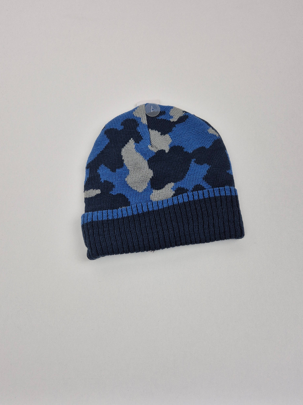Pletená čepice KiK v kombinaci tmavě modré, královsky modré a šedé s maskáčovým vzorem. Barevné ladění působí sportovně a je ideální pro malé dobrodruhy. Pružný lem dobře drží na hlavě a hřejivý úplet se hodí do chladnějších dnů – na ven, do školky i na běžné nošení.