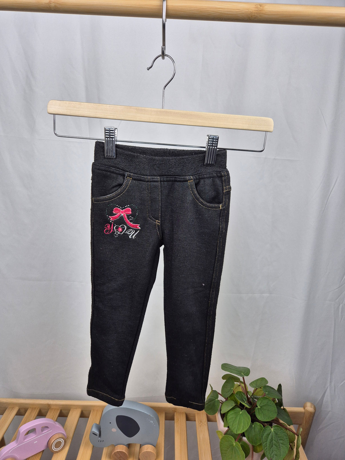 Stylové dětské legíny v černé barvě s jemným vnitřním chloupkem jsou ideální volbou pro chladnější dny. Design připomínající džínovinu s kontrastním prošíváním dodává moderní vzhled, zatímco pružný pas zajišťuje pohodlné nošení po celý den. Na přední straně zdobí nohavici výšivka s mašličkou a nápisem, která přidává roztomilý detail. Zadní kapsy s ozdobným prošíváním podtrhují džínový styl. Skvěle se hodí do školky, na procházky i na běžné nošení. Pohodlný a praktický kousek do šatníku každé malé parádnice!