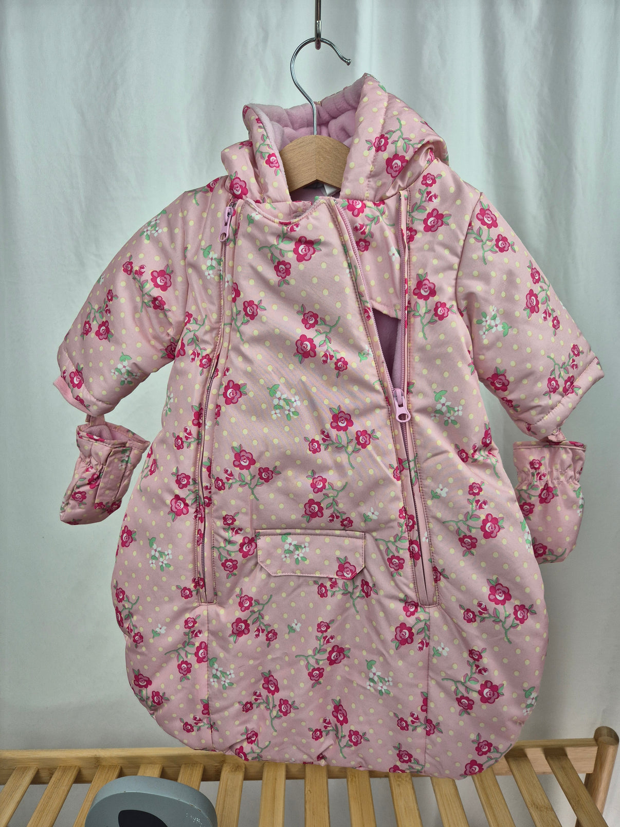 Roztomilý zimní fusak Jacky ve velikosti 56 je ideální pro úplně nejmenší miminka do kočárku. Jemný růžový podklad zdobí celoplošný květinový potisk v malinových odstínech, doplněný drobnými žlutými puntíky, takže působí opravdu něžně. Uvnitř je měkká a hřejivá podšívka, která miminko krásně udrží v teple. Praktické dvojité zipy umožní fusak pohodlně a rychle rozepnout, rukavičky jsou připevněné, aby se neztratily, a kapuce chrání před chladem i větrem. Skvělá volba na zimní procházky pro malou holčičku.