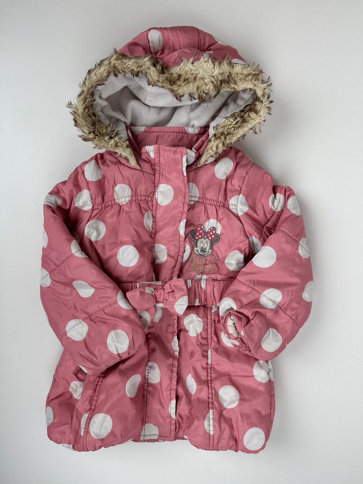 Tohle je holčičí zimní kabát značky Matalan, velikost 80/86, v růžové barvě s bílými puntíky a výšivkou Minnie Mouse. Kabát má pásek na zavazování, kapuci lemovanou umělou kožešinkou a uvnitř hřejivou fleecovou podšívku – skvělý na zimu.