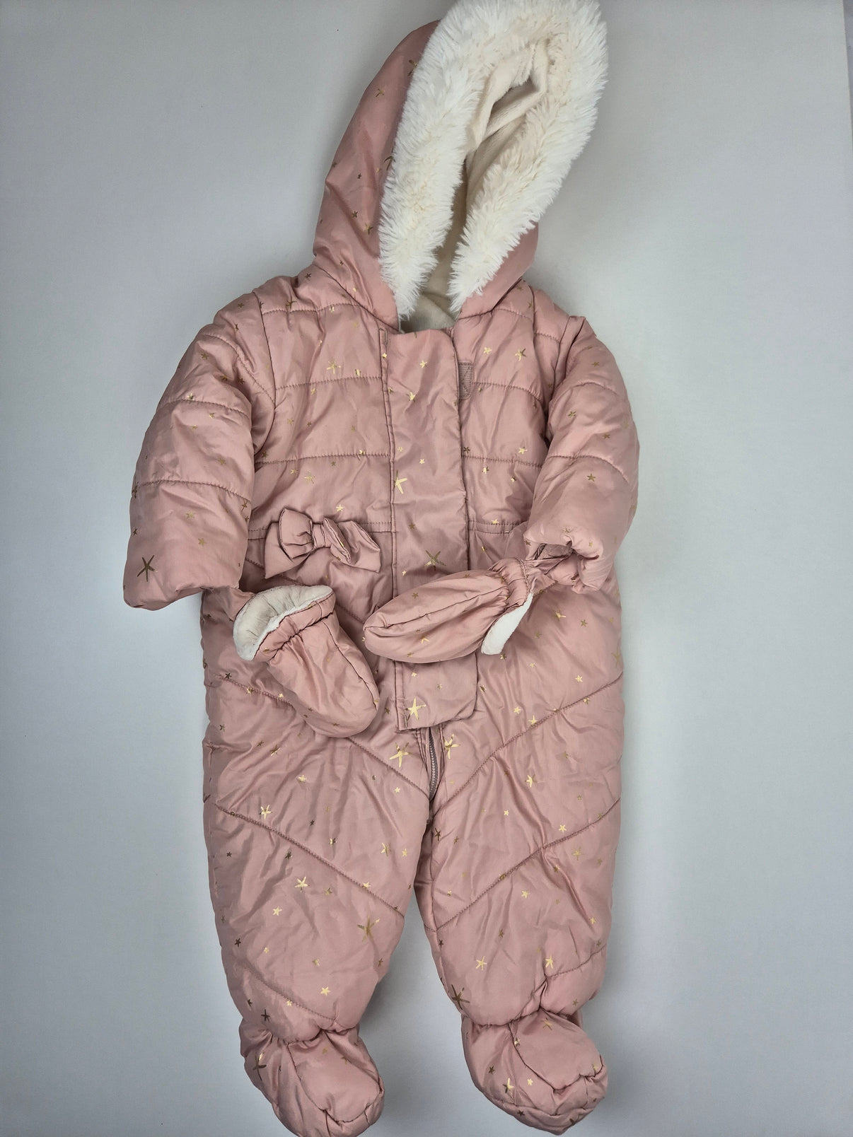 imní kombinéza George v jemném starorůžovém odstínu s drobným celoplošným potiskem zlatých hvězdiček. Barva působí něžně a elegantně, vnitřek kapuce je podšitý hebkým krémově bílým chloupkem, který dodává kombinéze luxusní a hřejivý vzhled. Roztomilá mašlička v pase krásně podtrhuje holčičí styl.