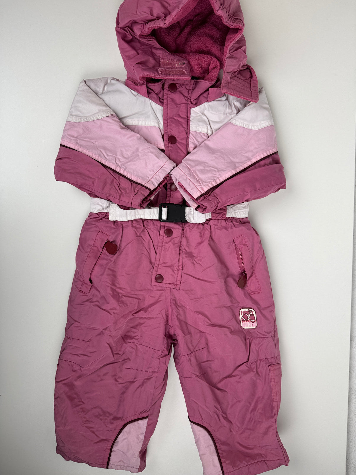 Zimní kombinéza značky Kiki&Koko ve velikosti 86, v růžových odstínech s bílými pruhy na rukávech. Kombinéza má kapuci, pásek v pase a je podšitá teplým fleecem. Skvělá volba na zimní období, aby byla malá slečna v teple a pohodlí.