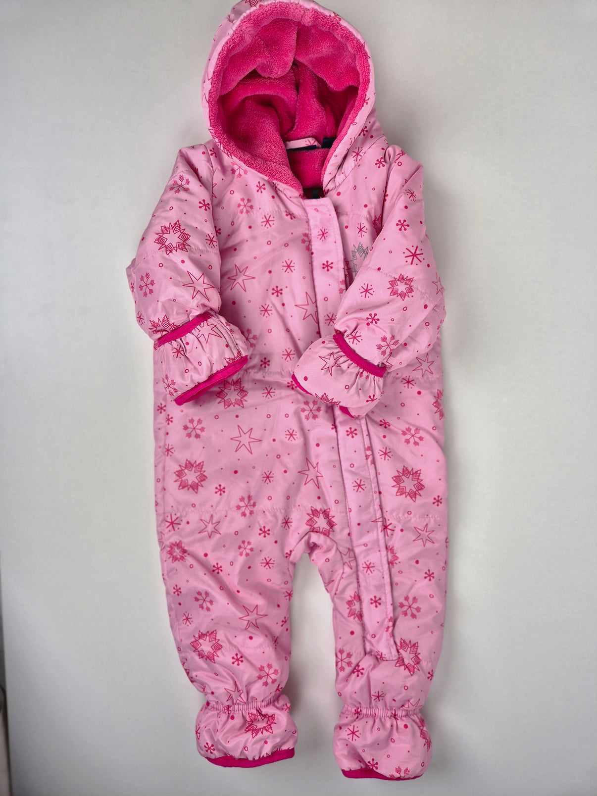 Růžová zimní kombinéza značky Lupilu ve velikosti 62/68. Kombinéza má kapuci s teplou fleecovou podšívkou, praktické zapínání na zip po celé délce s krycí légou a pružné zakončení rukávů i nohavic, aby neprofukovala. Hravý potisk hvězdiček a vloček dodává veselý vzhled. Ideální pro malé holčičky na zimu a chladné dny.