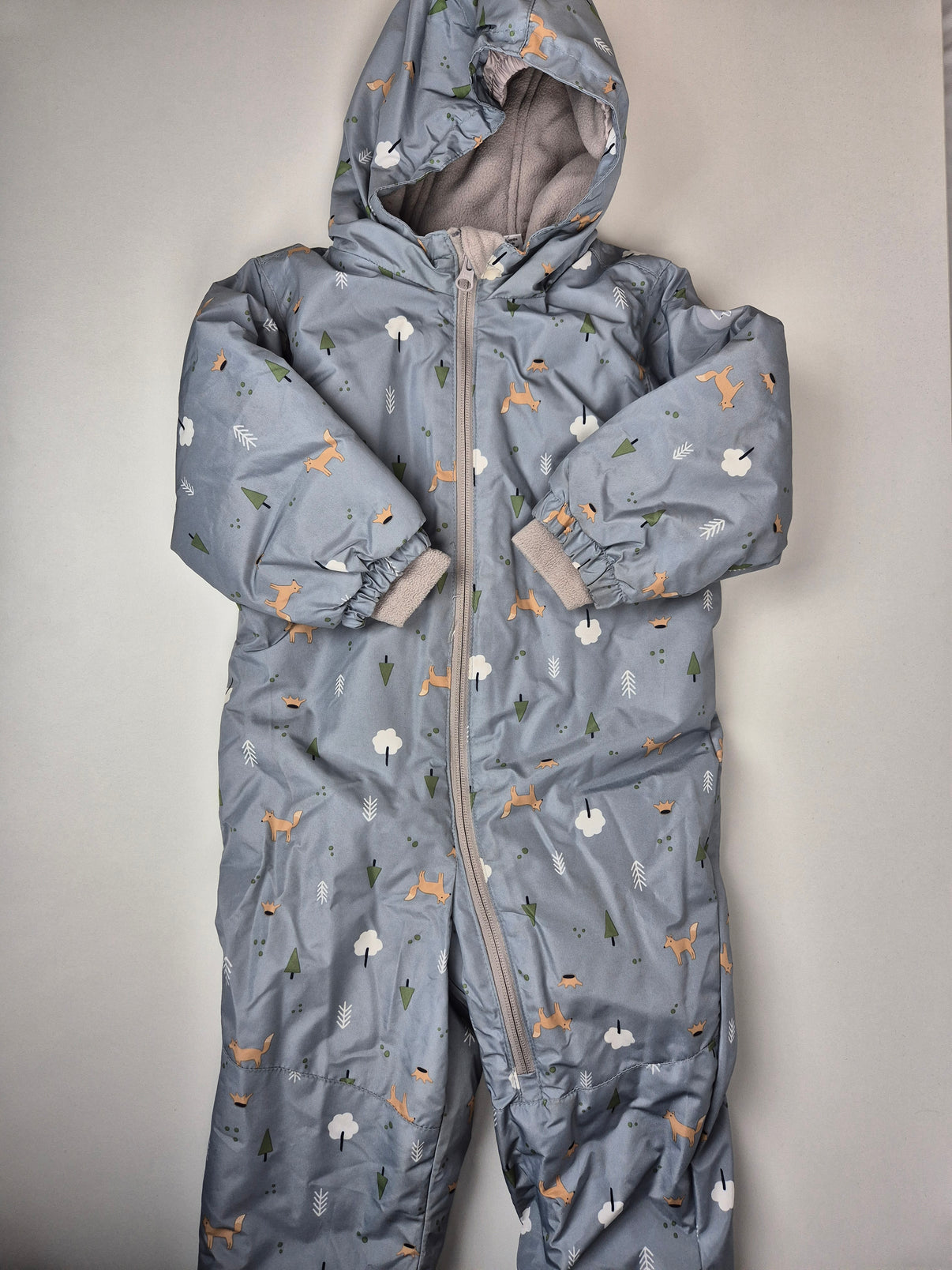 Zateplená dětská kombinéza v jemném modrošedém odstínu s hravým celoplošným potiskem lesních motivů – lišky, stromečky a obláčky. Barevně velmi příjemná a neutrální, vhodná jak pro kluka, tak pro holčičku. Vnitřní strana je podšitá měkkým šedým fleecem, který zajistí teplo a pohodlí i v chladných dnech.