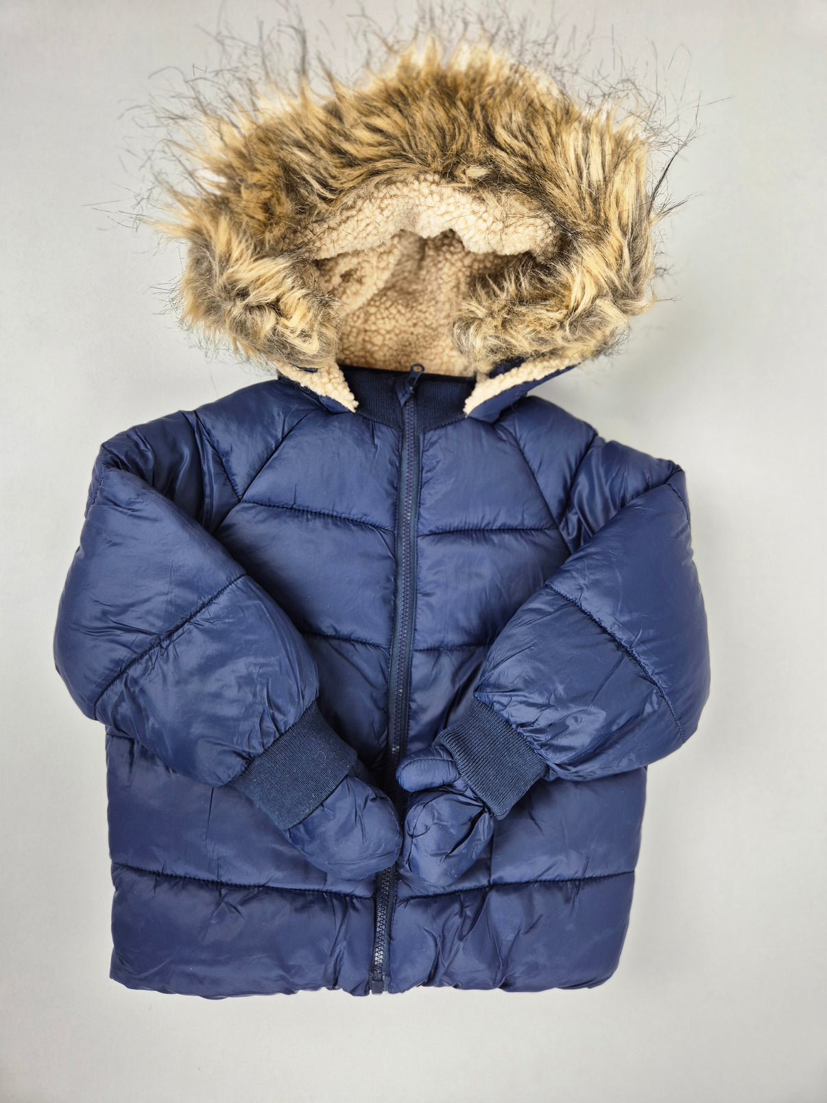 Teplá zimní bunda s kapucí lemovanou kožíškem a huňatou fleecovou podšívkou. Zapínání na zip, součástí i rukavičky. Velikost 86.