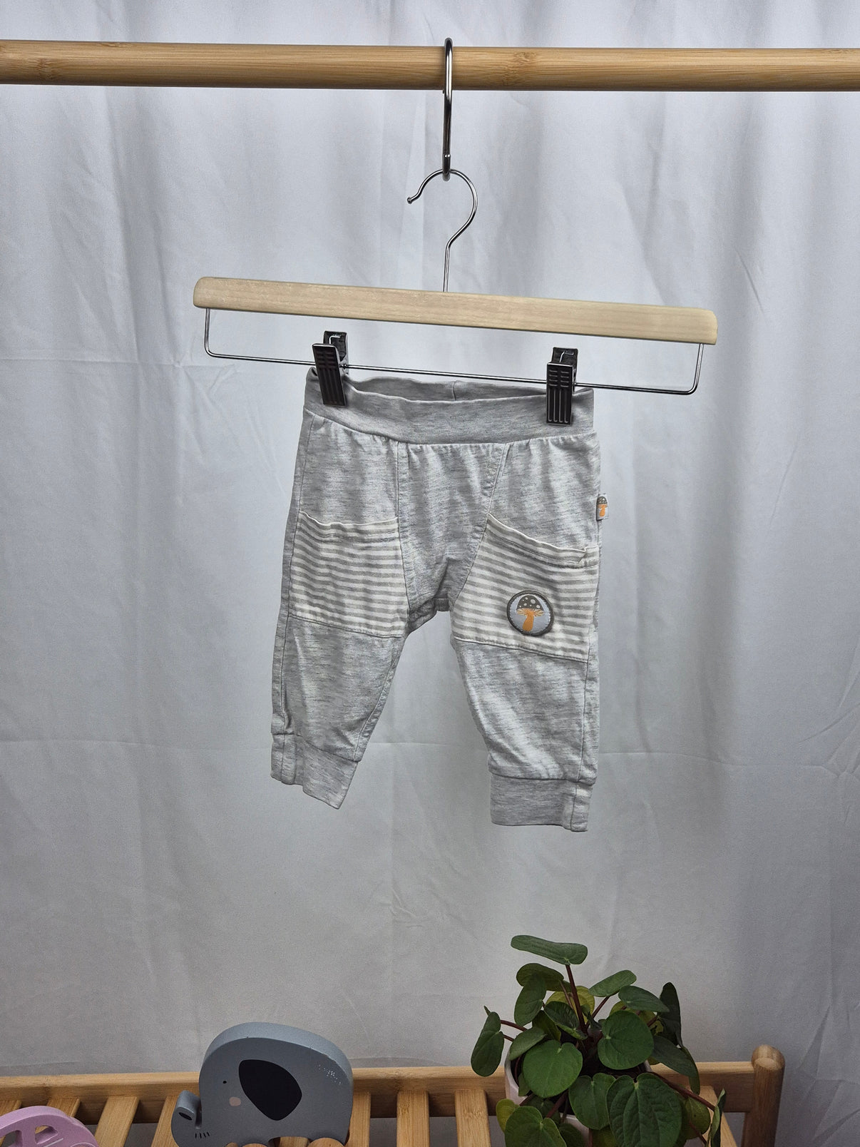 Dětské šedé tepláčky značky G-mini ve velikosti 68. Pohodlný střih s elastickým pasem zajišťuje komfort při nošení a volnost pohybu. Jemné proužky a roztomilá nášivka s motivem houby dodávají kalhotám...