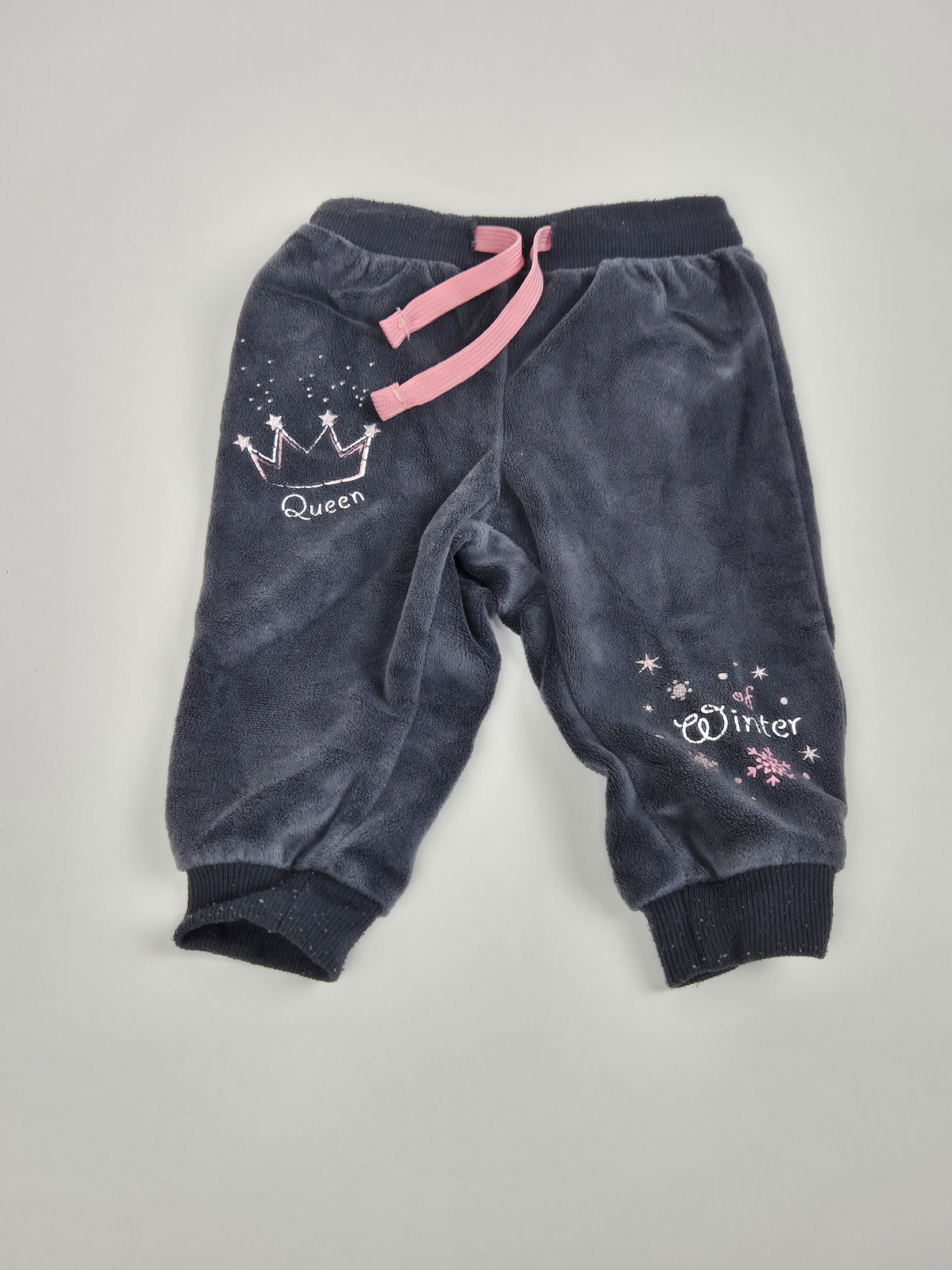 Tmavě modré sametové tepláčky Pepco s růžovými detaily. V pase mají růžovou šňůrku na stažení a na nohavici zdobí výšivka korunky s nápisem „Queen“ a motiv zimních vloček „Winter“. Pružné lemy na nohavicích zajistí pohodlí a drží kalhoty na místě. Velikost 74, vhodné pro holčičky.