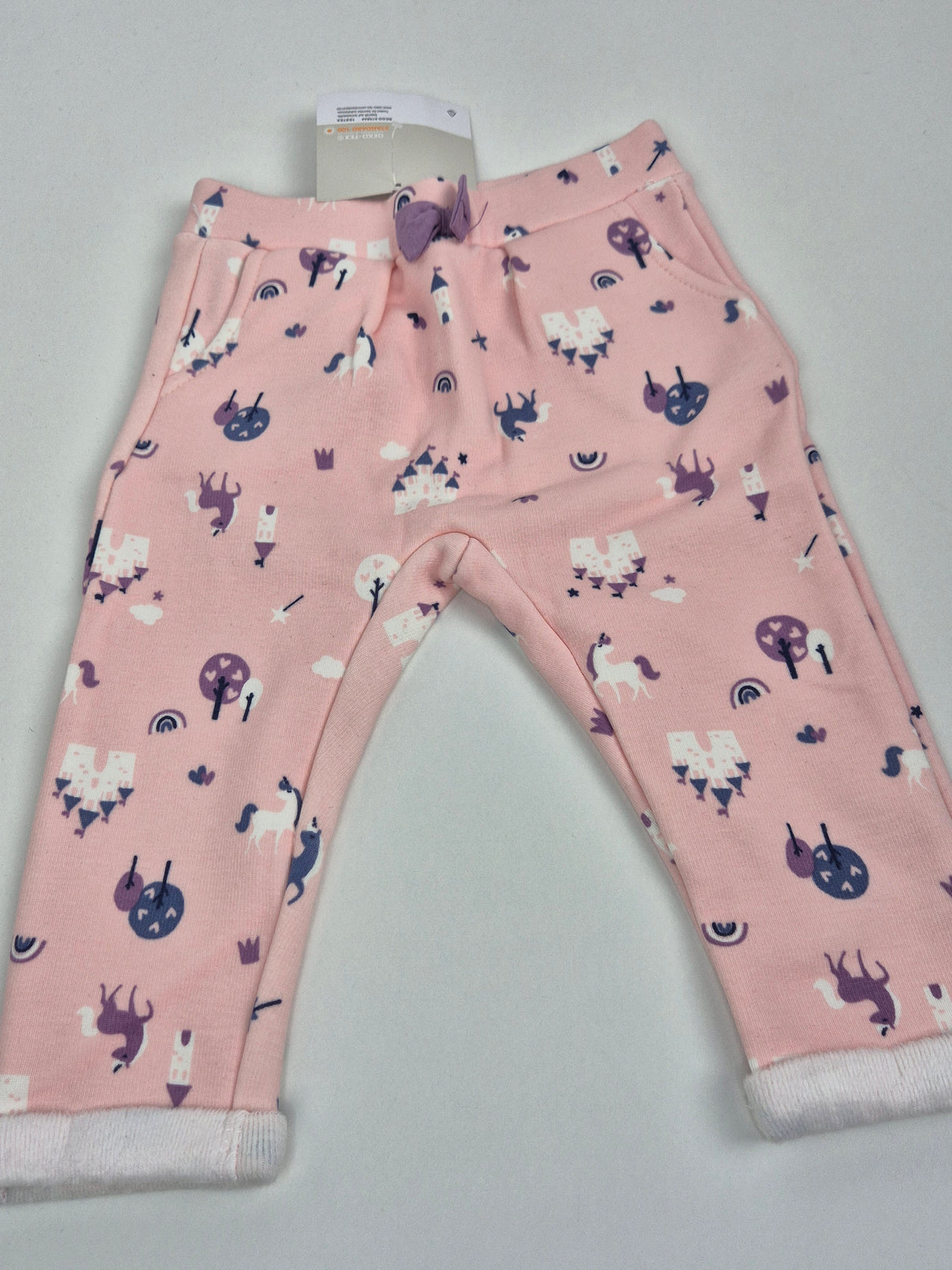 Roztomilé tepláky Ergee v jemné světle růžové barvě s kouzelným potiskem poníků, hradů, duhovek a stromečků jsou perfektním kouskem pro malé princezny. Měkoučký vnitřní chloupek krásně zahřeje, takže jsou ideální na chladnější dny. Praktický pružný pas se šňůrkou a žebrované lemy na nohavicích zajistí pohodlné nošení. Skvělá volba pro holčičku na doma i ven.