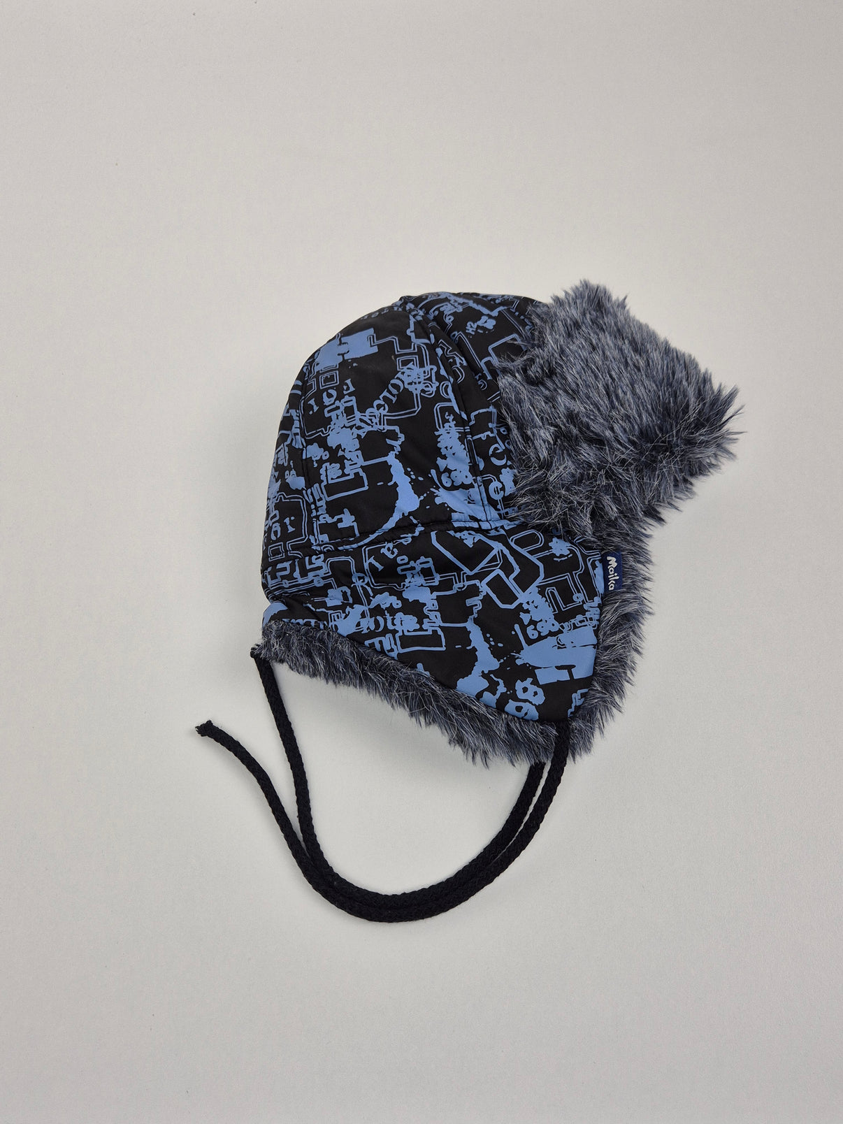 Teplá zimní čepice značky Majka v kombinaci černé a modré barvy s výrazným grafickým vzorem. Uvnitř i po okrajích je hebký šedý chloupek, který krásně zahřeje uši i čelo. Praktické zavazování pod bradou pomůže udržet čepici na místě i při divočejších zimních radovánkách.