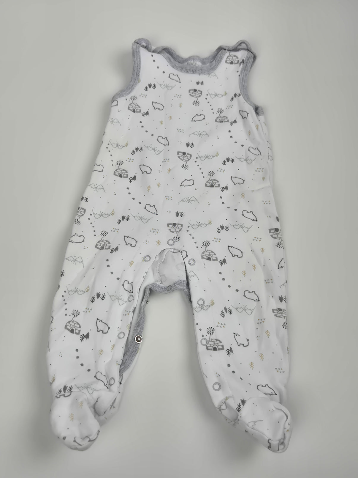 Roztomilé dupačky značky Boley v bílé barvě se šedým lemováním a veselým potiskem medvídků, hor, autíček a stromečků jsou ideální pro pohodlné spaní i celodenní lenošení doma. Měkký a příjemný materiál je šetrný k citlivé dětské pokožce. Zapínání na patentky mezi nožičkami usnadní přebalování. Díky neutrálnímu designu jsou dupačky vhodné jak pro holčičku, tak pro chlapečka. Skvělá volba na doma i do kočárku.