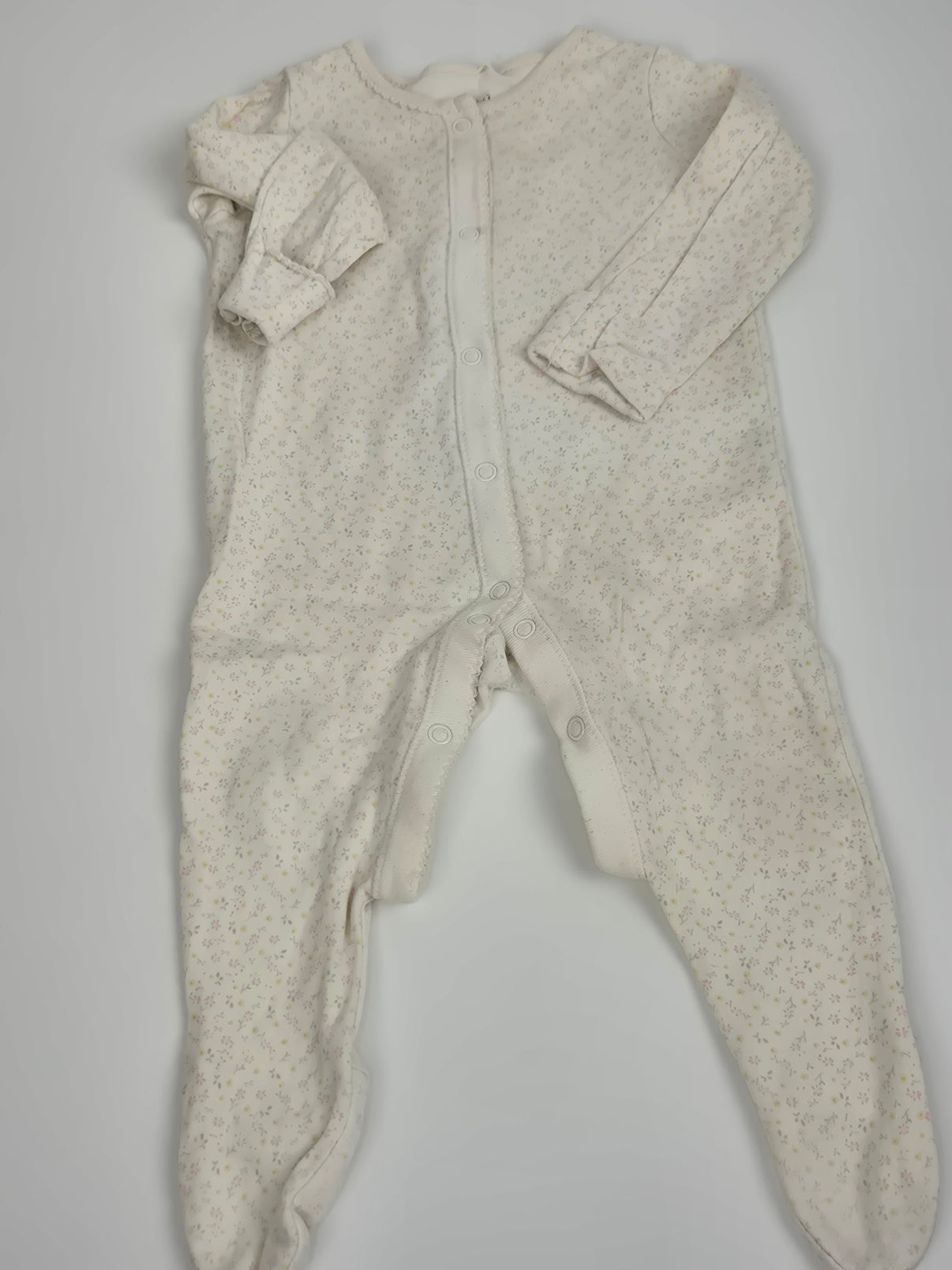 Příjemné dupačky s jemným květinovým vzorem ve velikosti 74 od značky F&F jsou skvělou volbou pro každodenní pohodlí miminka. Krémový základ s drobným potiskem působí něžně a elegantně. Zapínání na druky po celé délce usnadňuje oblékání i přebalování. Ideální kousek pro holčičku na spinkání i domácí lenošení.