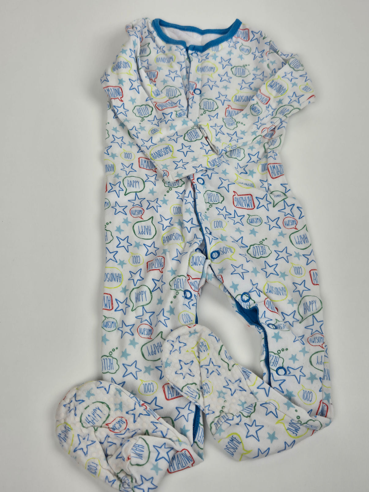Barevné dupačky F&F s dlouhým rukávem a veselým potiskem hvězdiček a nápisů (Happy, Cool, Hello). Praktické zapínání na patentky po celé délce pro snadné oblékání a přebalování. Pohodlný kousek z příjemného materiálu, ideální na spaní i hraní.