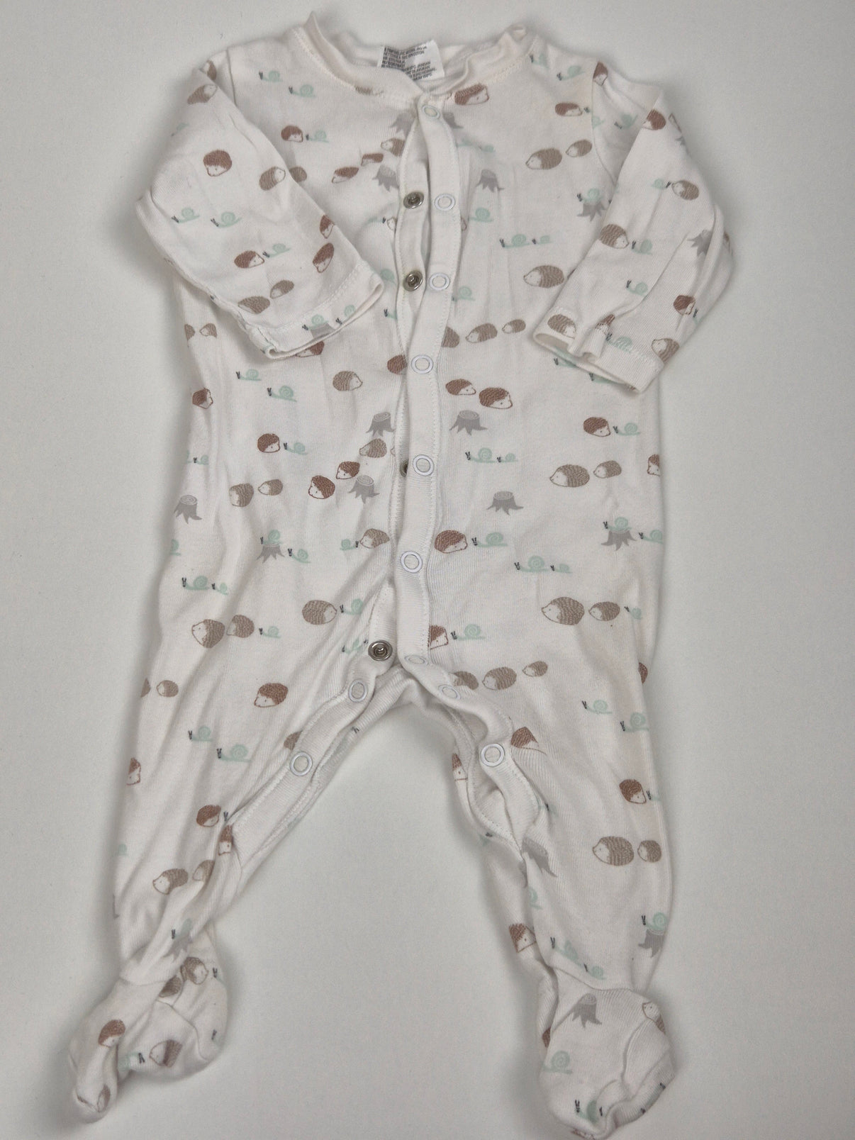 Roztomilé dupačky H&M v krémově bílé barvě s jemným přírodním potiskem ježků, šneků a pařezů v odstínech hnědé, šedé a zelenkavé. Příjemný bavlněný materiál a zapínání po celé délce zajistí...