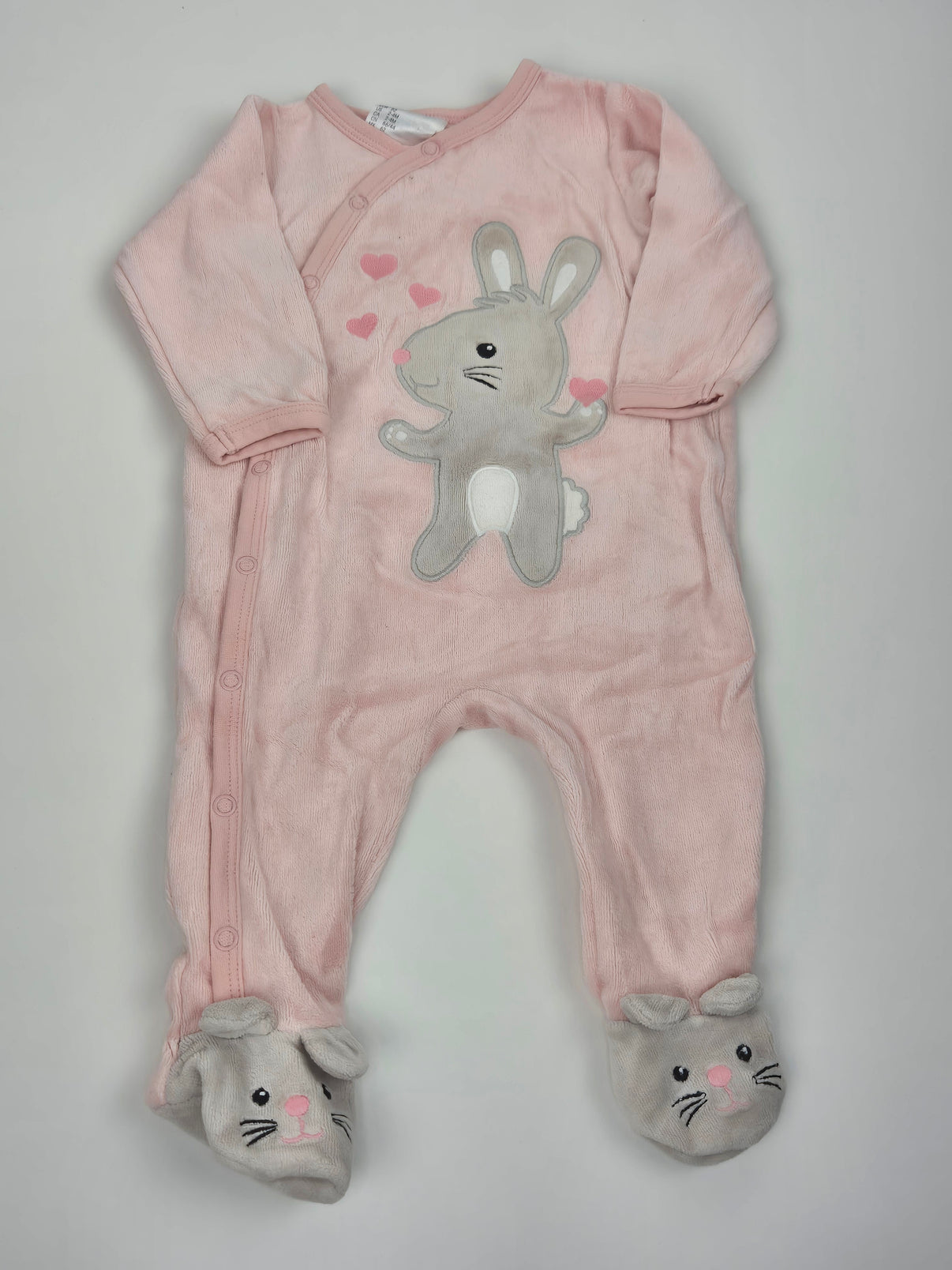 Světle růžové sametové dupačky s dlouhým rukávem značky H&M, zdobené velkou aplikací šedého králíčka s růžovými srdíčky na přední straně. Integrované ťapky mají roztomilý 3D design králíčkových hlaviček s oušky a vyšívaným obličejem. Zapínání na patentky po celé délce a po jedné nohavici usnadňuje oblékání i přebalování. Měkký a hřejivý materiál je ideální pro pohodlný spánek i domácí pohodu malých holčiček.