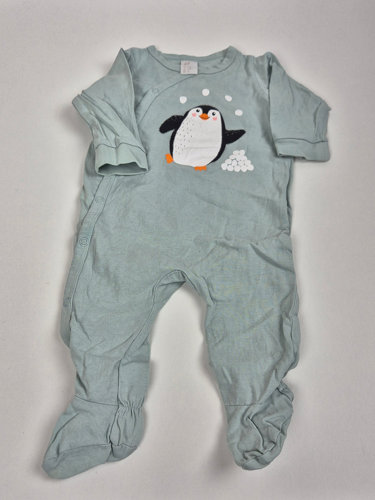Roztomilé dupačky H&M v jemné pastelově zelené barvě s velkou aplikací veselého tučňáka a sněhových koulí. Praktické zapínání na patentky po boku a mezi nožičkami usnadní převlékání i přebalování. Měkký a pohodlný materiál je ideální na spaní i každodenní nošení. Skvělý univerzální kousek pro holčičku i chlapečka.