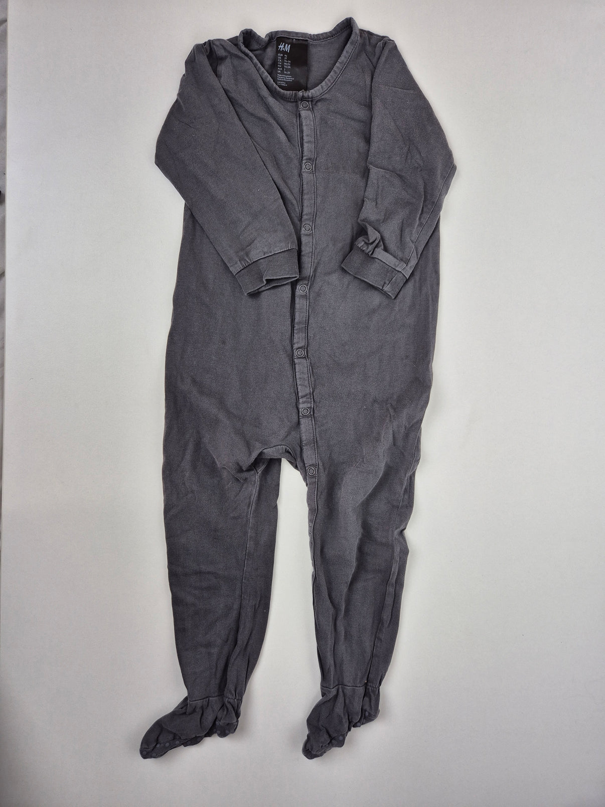 Stylové dupačky značky H&M ve velikosti 92 v tmavě šedé barvě s minimalistickým vzhledem, ideální pro chlapečka i holčičku. Díky zapínání na cvočky po celé délce se snadno oblékají i svlékají. Měkký a pohodlný materiál je vhodný na denní nošení doma, na spaní i do kočárku. Skvělý univerzální kousek pro každodenní pohodu s jednoduchým, moderním designem.