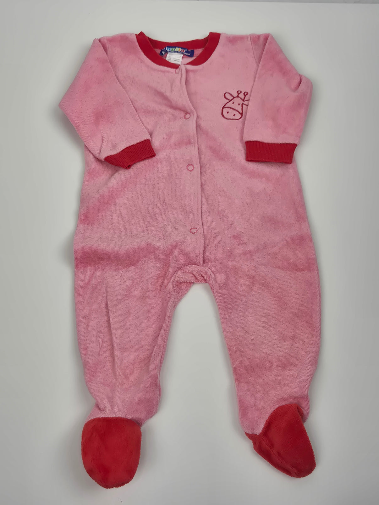 Jsou v růžové barvě s kontrastními červenými lemy na rukávech, kolem krku a na chodidlech. Na hrudi je malá výšivka roztomilé žirafy. Zapínání je na patentky po celé délce předního dílu, což usnadňuje oblékání a přebalování.